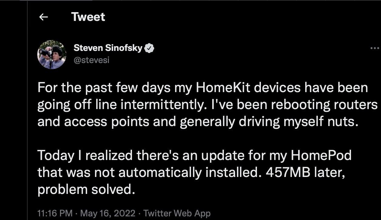 Öffnet man die Home App am iPad/iPhone oder nennt Befehle über den HomePod, so steht bei allen Geräte des smarten Zuhauses „Aktualisieren“ bzw. Siri meldet, dass die Geräte zu lange benötigen und es passiert nichts mehr. Dieser Status ändert sich auch nicht, wenn bspw. die App länger offen bleibt. Am iMac lassen sich die Geräte über die Home App nach kurzer Wartezeit allerdings Steuern. Auch in den jeweiligen Apps der Herstellern wie der Philips Hue App lassen sich die Geräte problemlos auch auf iPhone/iPad ansteuern.
