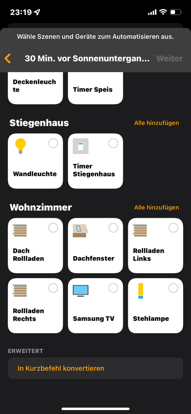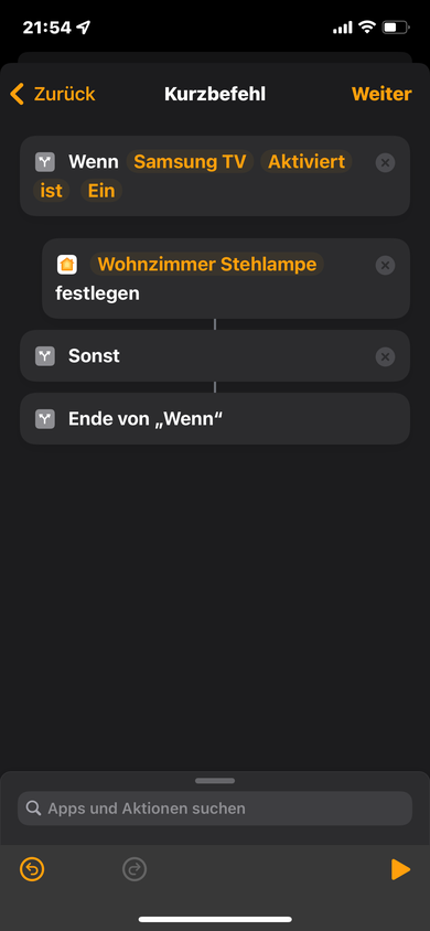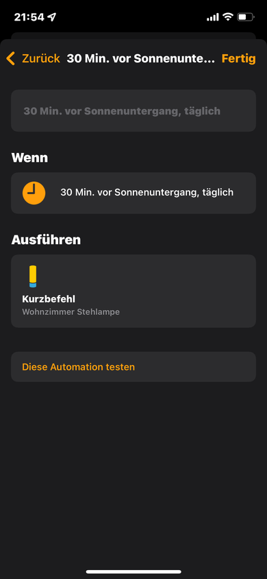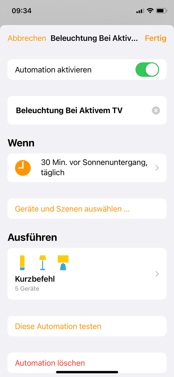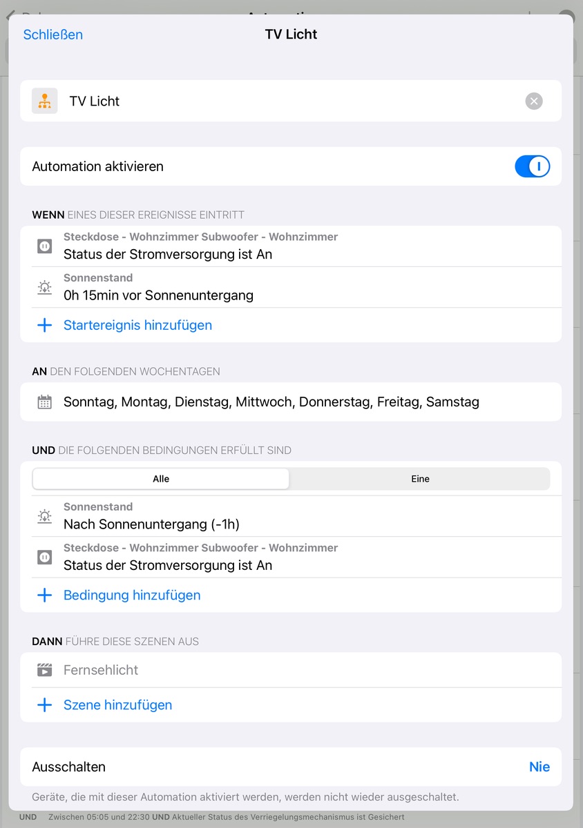 Wenn ich 1/2 Stunde vor Sonnenuntergang (und auch danach) den Fernseher einschalte, soll sich automatisch das indirekte Fernsehlicht (Nanoleaf Stripe) mit einschalten. Der TV ist ein Homekitfähiger LG OLED. Diese Automation funktioniert so wie sie soll.