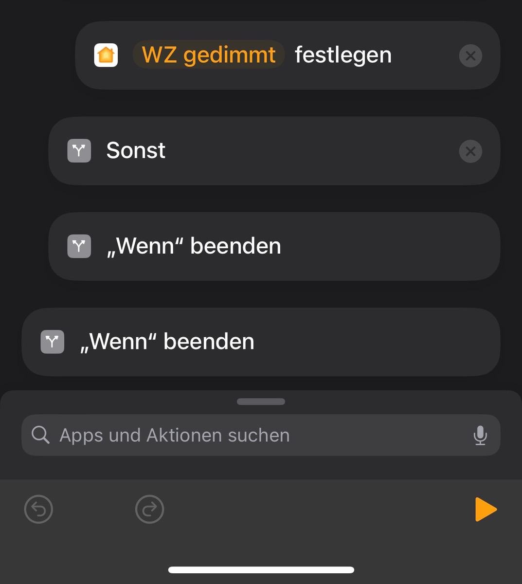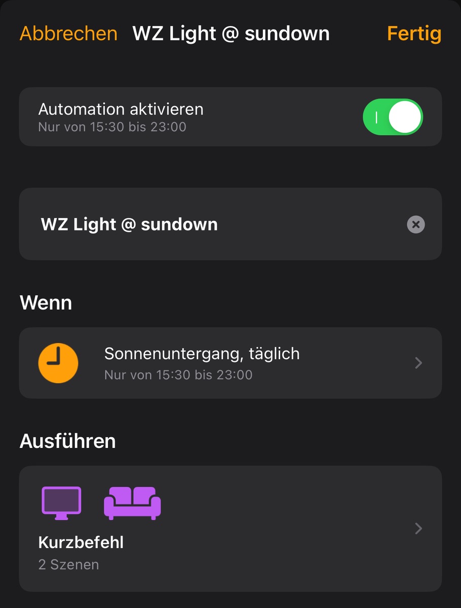 Die Automation habe ich in Home erstellt, zwecks Kurzbefehl. Danach hab ich die Automation in Controller für HomeKit „verfeinert“. Also weitere Bedingungen und Abhängigkeiten hinzugefügt. Leider kann ich keinen Screenshot davon zeigen, da ich die Automation umgestellt habe.