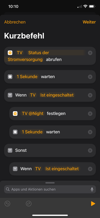 Dann kommt der Kurzbefehl… als erstes muss Du den Zustand des TV Abfragen, damit HomeKit weiss, wie der Zustand aktuell ist.