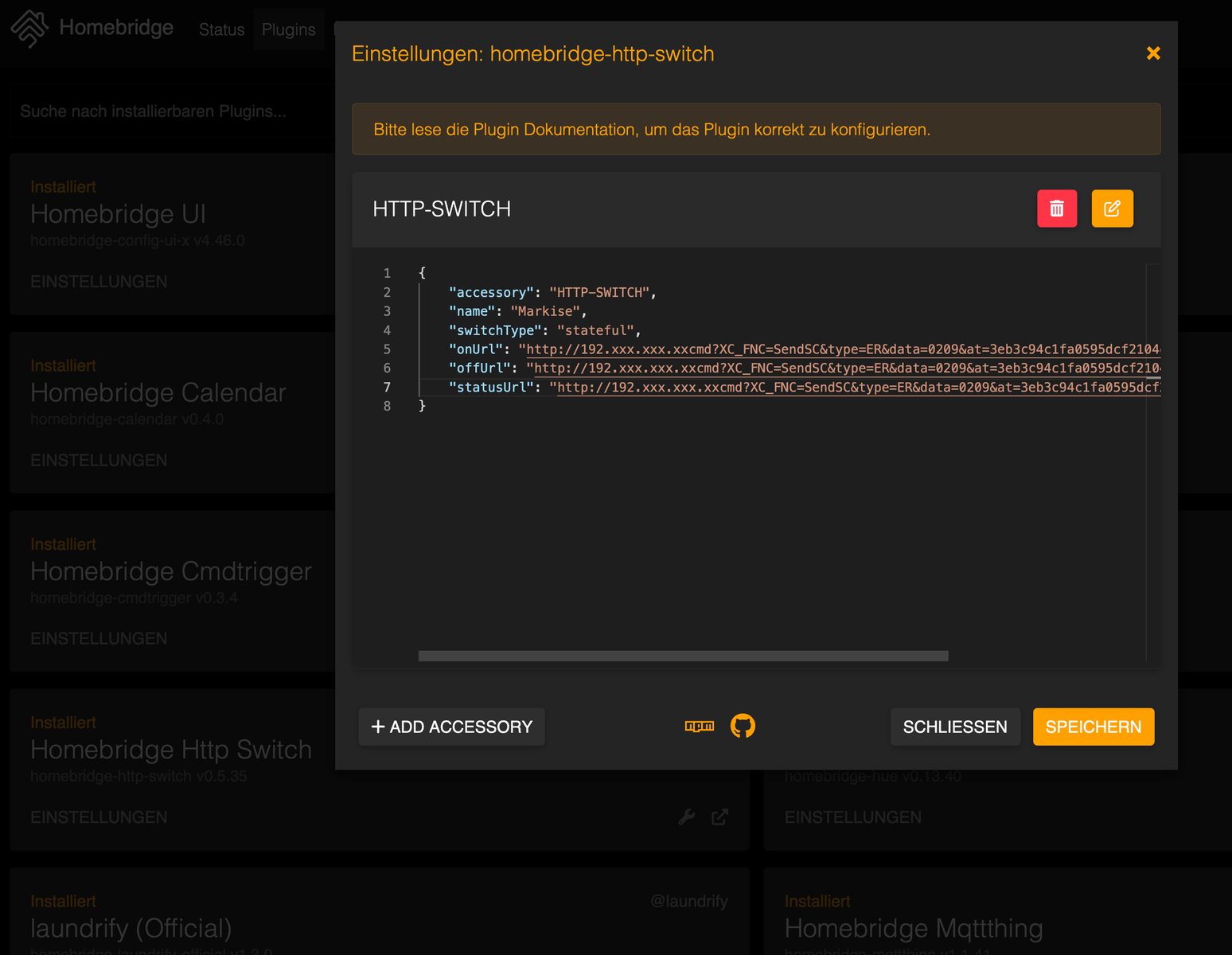 Da die virtuellen Taster im HomeKit als nicht definiert angezeigt werden und ohne Funktion sind, war meine Idee, ein Plugin zu installieren, was einen Taster über die HomeBridge ins HomeKit bringt und dann, nach Druck auf diesen Taster den HTTP-Befehl an die Markise sendet.