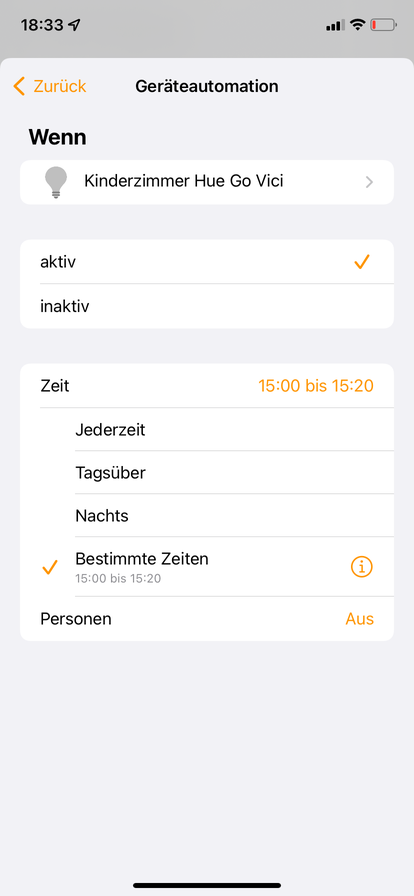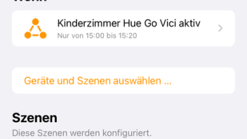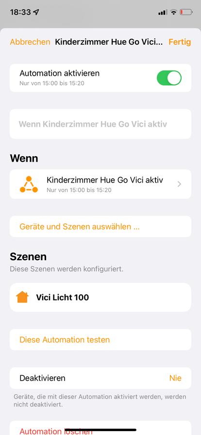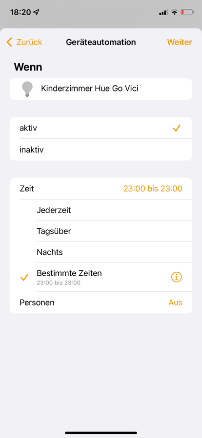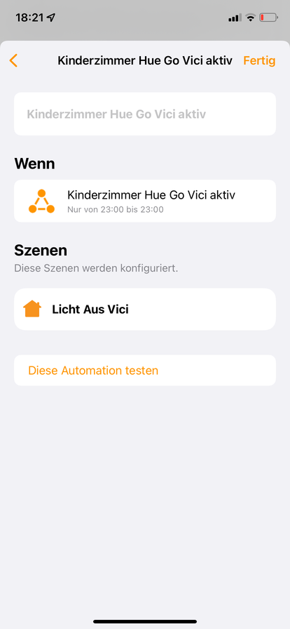 1. Im Zimmer meiner Tochter steht eine Hue Go Tischlampe. Wenn ich die Kleine abends ins Bett bringe nutze ich sie als Nachtlicht (ca. 10 %). Sie soll dann einfach Nachts ausgehen (gegen 23:00 Uhr).