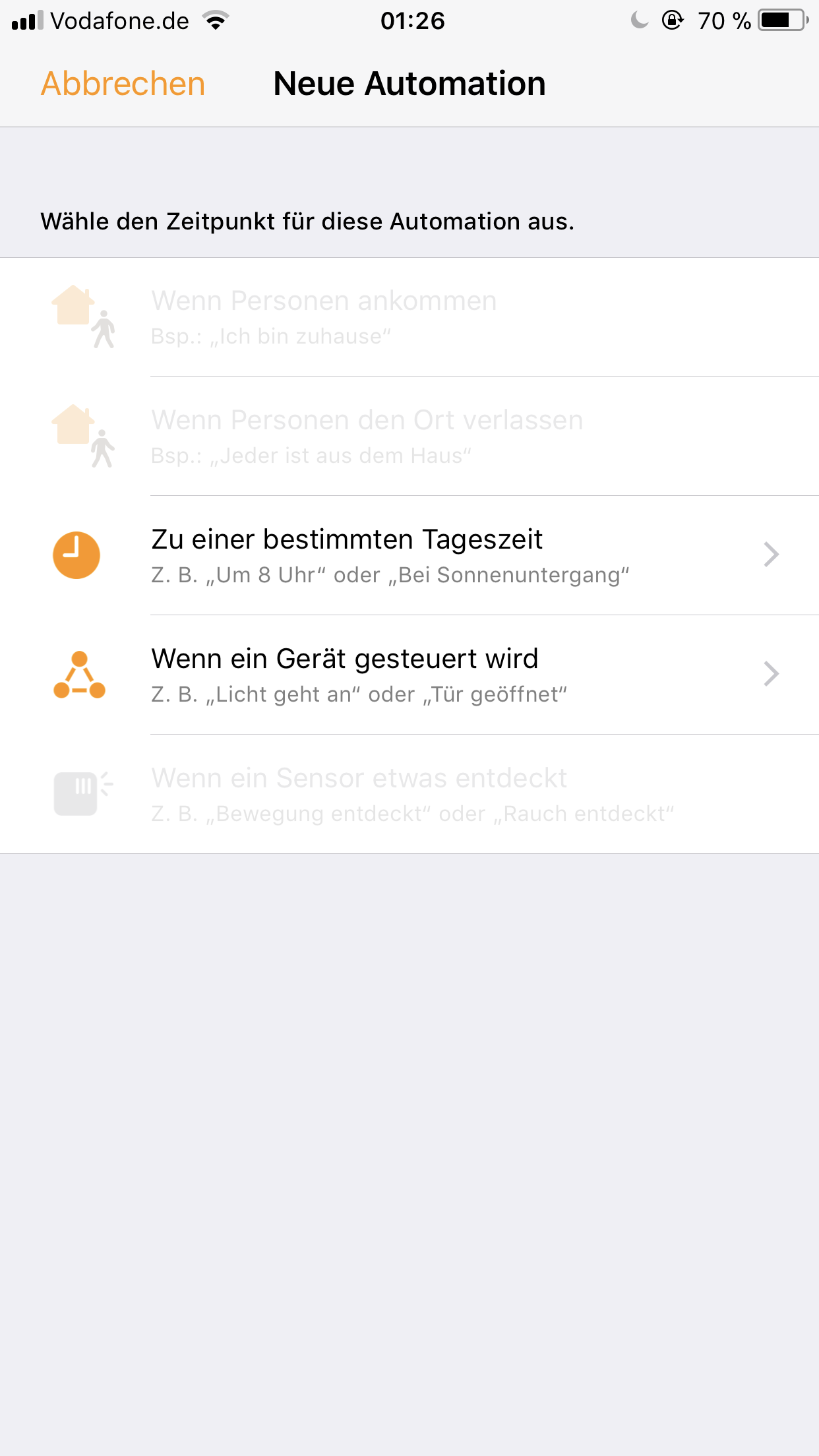 Ich wollte mal fragen, ob es irgendwie eine Möglichkeit gibt mit dem IKEA TRÅDFRI System alle automationen in HomeKit zu nutzen? Da sind bei mir nämlich momentan nur zwei verfügbar. Ich kann lediglich zu einer bestimmten Zeit die Lampen einschalten lassen, möchte aber gerade solche Funktionen wie, dass alle Lichter an gehen, wenn ich zuhause bin oder alle aus, wenn ich das Haus verlasse. Ist es generell nicht möglich das mit Ikeas System zu machen? Oder muss ich irgendwo was anderes einstellen?