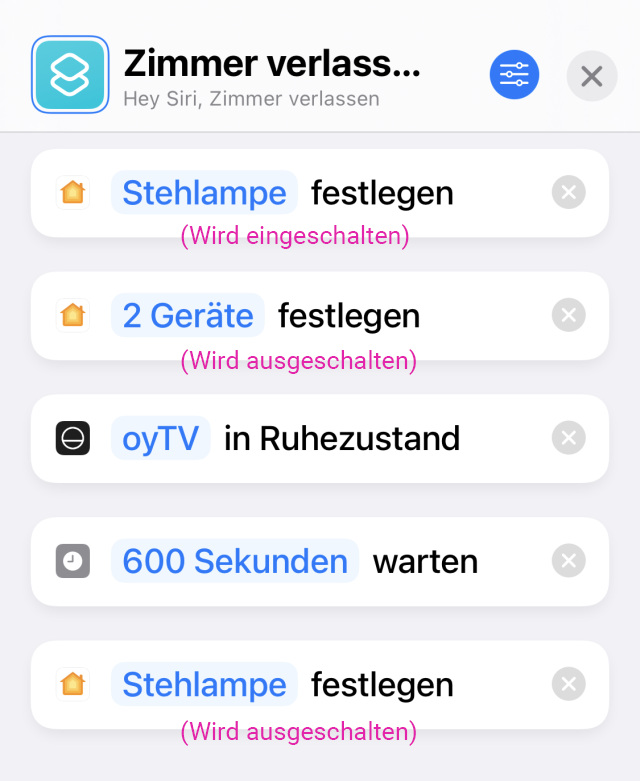 Sage ich aber "Hey Siri, Zimmer verlassen", so wird alles ausgeführt, bis auf den letzten Schritt. Siri teilt mit: