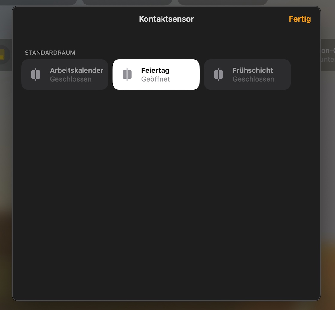 In der Home App allerdings ist der Sensor "Frühschicht" weiterhin drin und der Sensor "Urlaub" fehlt.