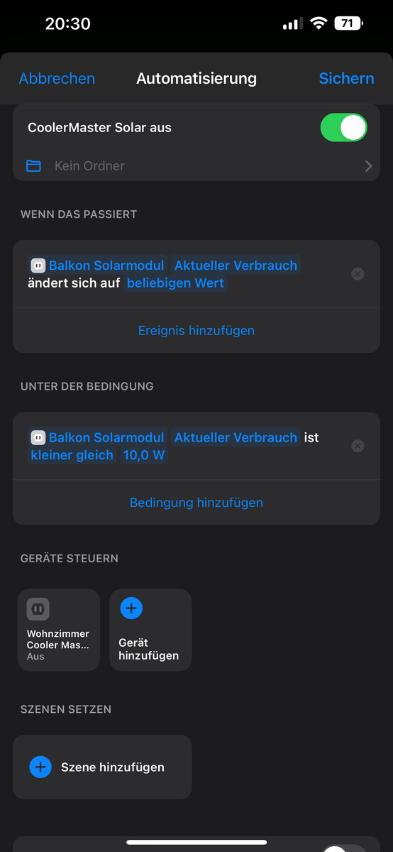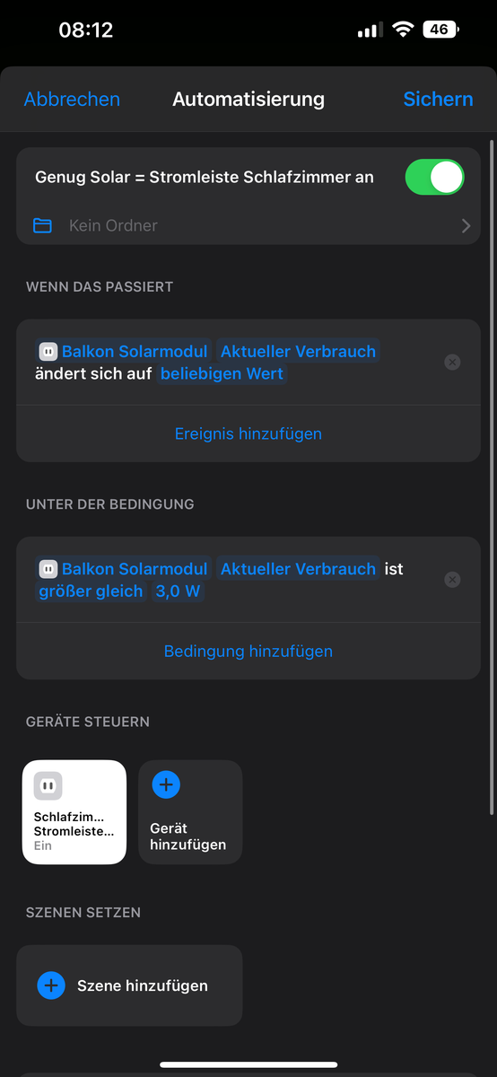 Ich habe es bereits über die Eve App versucht, aber hier wird die Aktion einfach nicht ausgelöst, um es am besten zu testen, habe ich einfach eingestellt "Wenn das Solar Modul mehr wie 50 Watt liefert = Gerät an, wenn weniger = Gerät aus", dann habe ich das Modul mit einem Tuch abgedeckt für ca. 2 Stunden, weil ich dachte, dass die Automation sich vielleicht erst einspielen muss... leider ohne Erfolg.