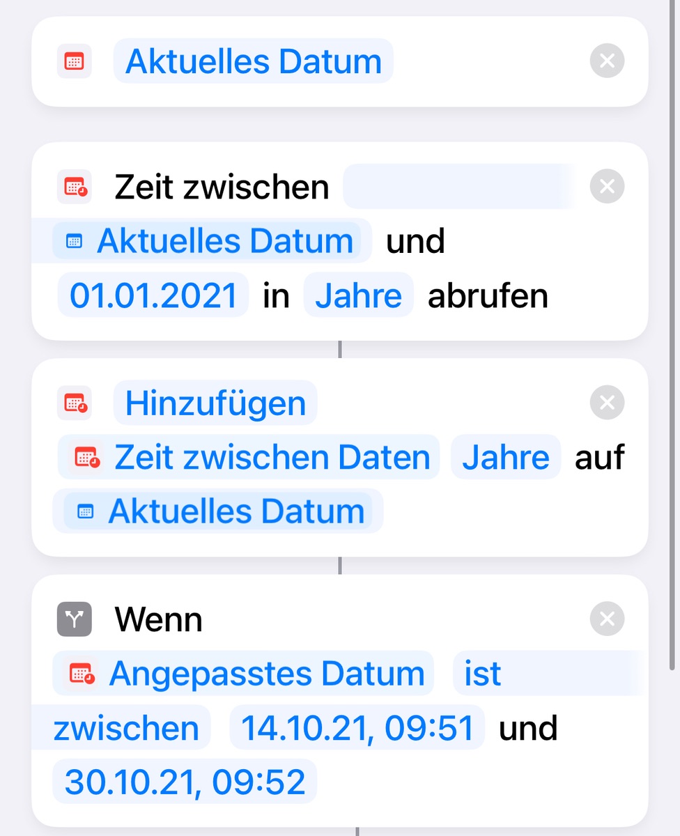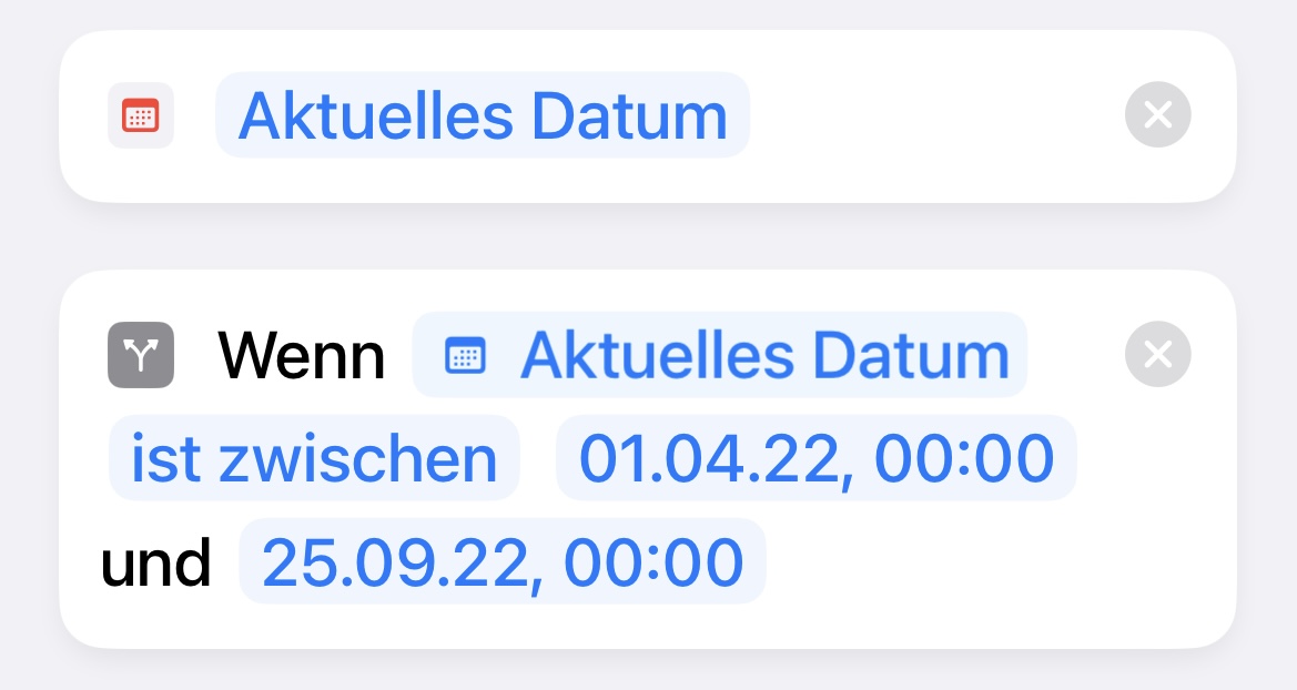 ich möchte einen Kurzbefehl zwischen zwei Daten ausführen. Dies aber jährlich und nicht nur im Jahr 2022. Ist dies irgendwie möglich?