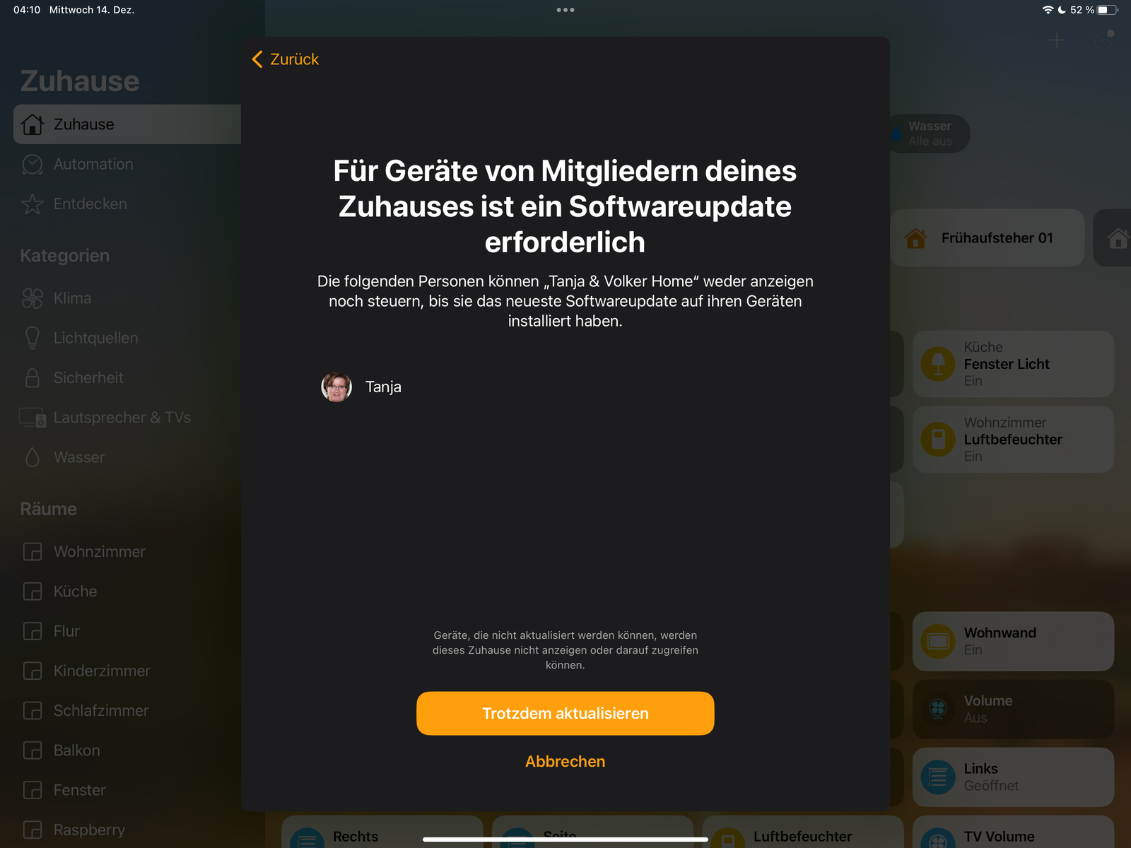 Weil ich habe das Upgrade jetzt gemacht. Es lief schnell und fast ohne Komplikationen durch. Nur die Reihenfolge der Bereiche war durcheinander und die Zuordnung einiger Räume zu ihren Bereichen war aufgehoben. Korrigiert - fertig. 3 Geräte wollten geupdatet werden. Welche und was für ein Update keine Ahnung. Gemacht - fertig.