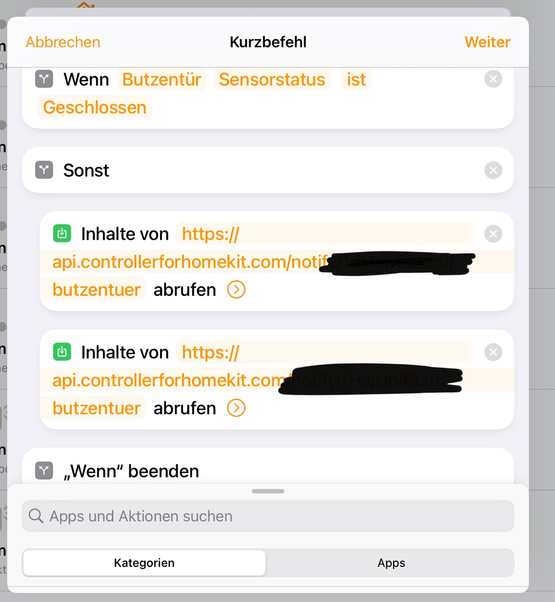 Genau das ist mit verzögerten Benachrichtigungen möglich. Bei der Erstellung kann neben der Nachricht zudem eine Verzögerung in Minuten festgelegt werden, nachdem die Benachrichtigung verschickt werden soll. Man erhält dabei zwei Links, die über einen Kurzbefehl in einer HomeKit-Automation aufgerufen werden können.