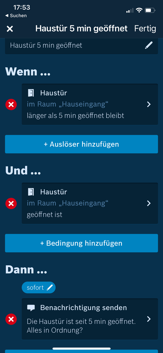 Wird das Fenster geöffnet, kann der Link “Benachrichtigung veranlassen” aufgerufen werden. Ab dann zählt der Countdown der eingestellten Verzögerung. Bei dem Schließen des Fensters kann hingegen über eine Automation der Link “Benachrichtigung absagen” aufgerufen werden. Wird das Fenster also innerhalb des Countdowns wieder geschlossen, wird keine Benachrichtigung versendet. Andernfalls wird diese nach Ablauf des Countdowns an die hinterlegten Geräte verschickt.