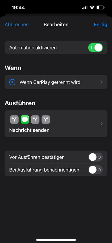 Ich hab jetz nochmal bissel probiert und rausgefunden, das beim trennen von CarPlay keine Bestätigung notwendig is. Aber es soll natürlich nicht jedes Mal ‘ne sms geschickt werden, wenn ich das Auto irg wo aus mache sondern nur, wenn ich daheim bin. Ich weis nur nich genau, wie ich das mit dem Standort machen soll…so?