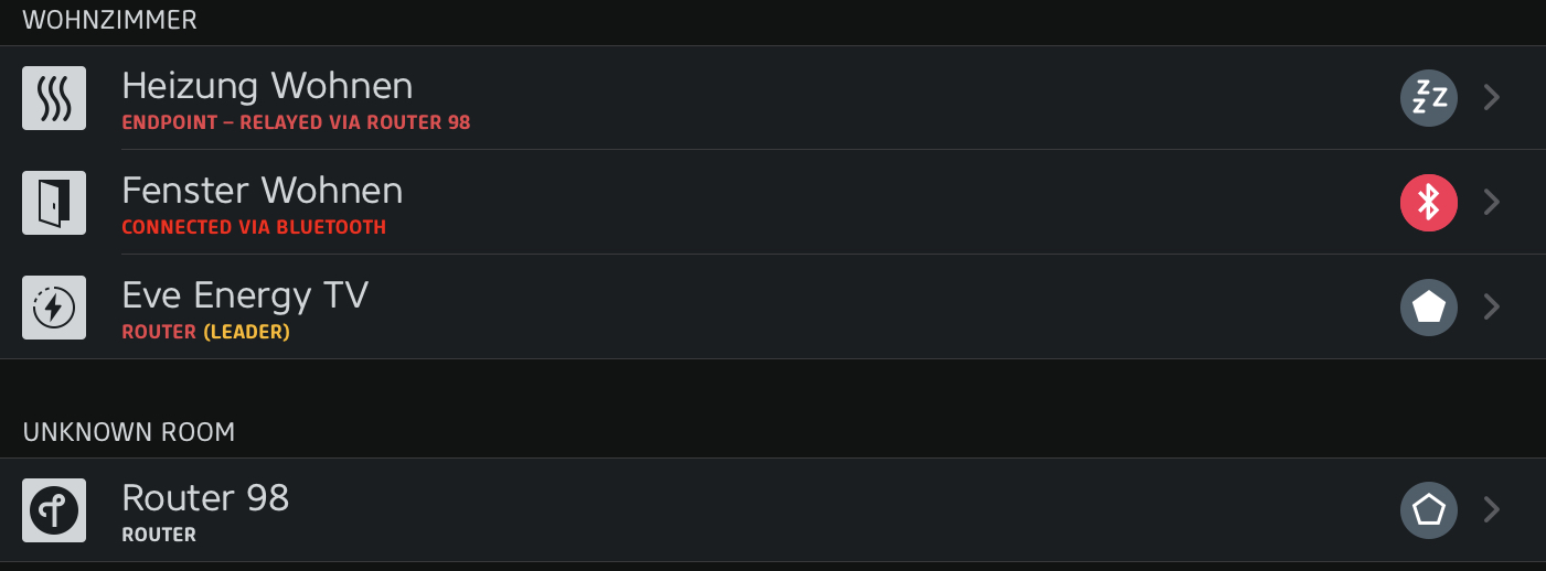 Auch etwas merkwürdig: „Fenster Wohnen“ hat bei mir in der Thread-Netzwerkübersicht das Bluetooth-Icon, „Fenster Küche“ hingegen jedoch wie „Heizung Wohnen“ das Icon mit den 3 „Z“ (siehe screenshot) - nur das Letztere in den Details bei Transport „Thread“ und bei Thread Status „Child“ angibt - beim Sensor in der Küche steht dort „Bluetooth“ und „Detached“.