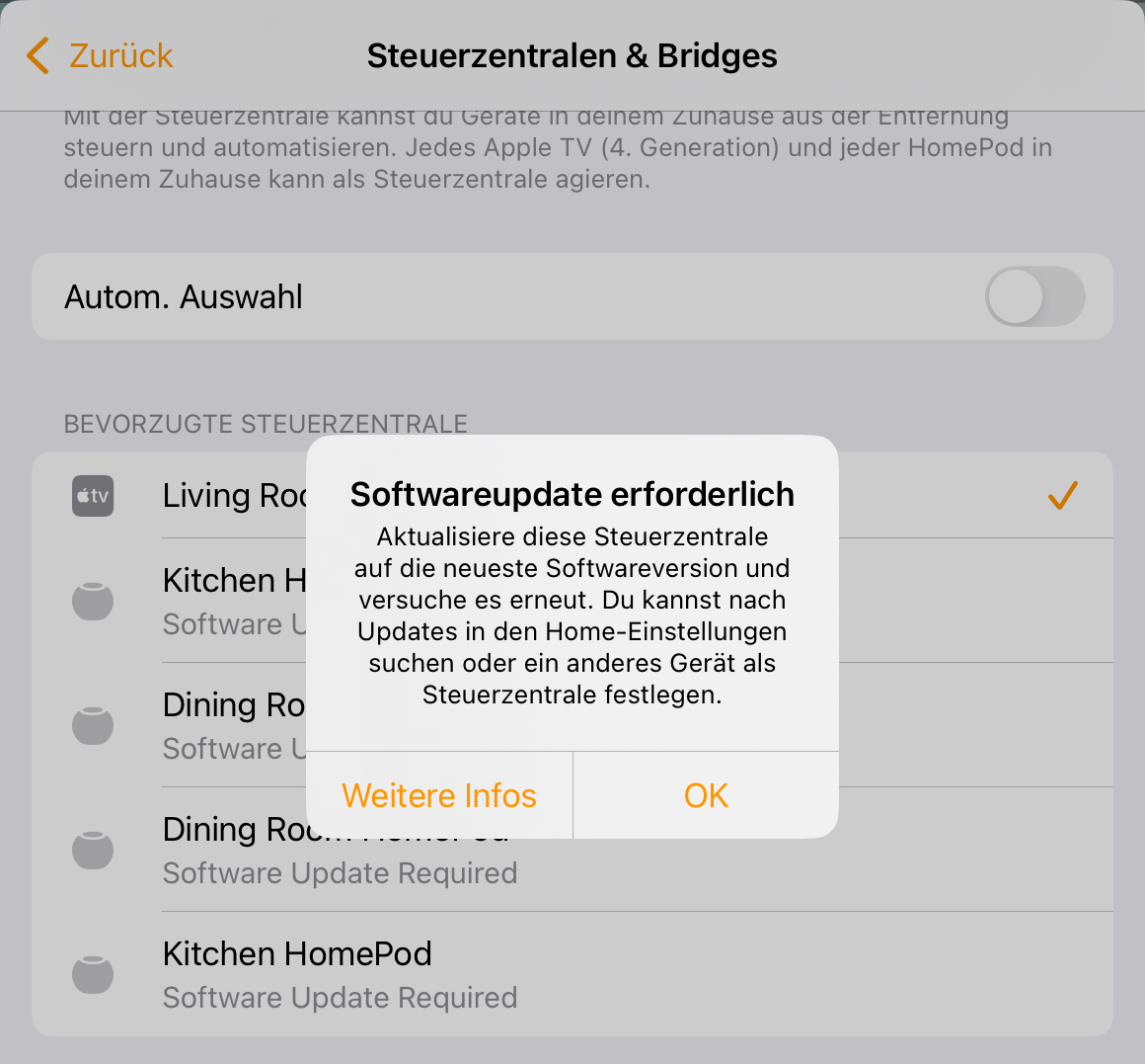 • So ein richtig valides Testszenario der neuen Funktion kann ich leider noch nicht bieten. Ja: Ich habe das ATV als bevorzugte Zentrale festgelegt und das funktioniert auch. Allerdings laufen die HP Minis alle mit OS 17.6 weil es (zumindest für mich) keine OS 18 Beta für die Dinger gibt. Somit erscheinen die zwar in der Liste der Steuerzentralen, können aber nicht ausgewählt werden. In Beta 1 stand da “Gerät nicht verfügbar”. Das hat sich nun geändert und es kommt zumindest eine vernünftige Meldung.