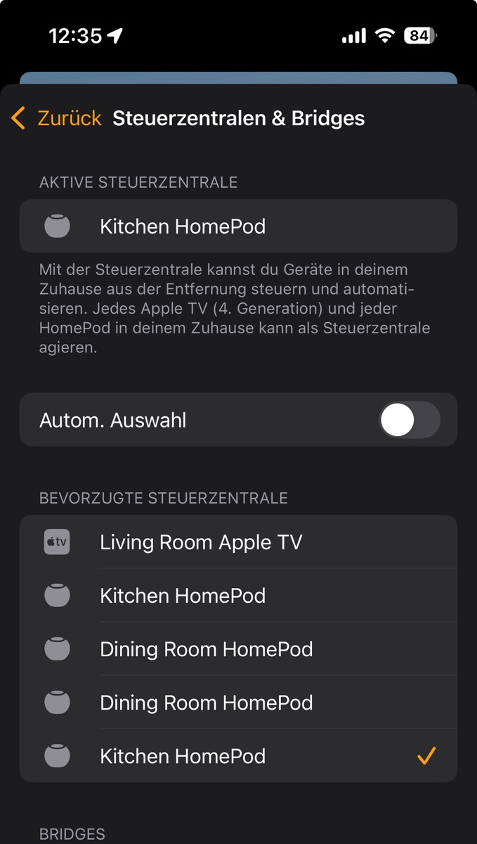 Hier hat es geholfen. Nach dem gestrigen Update aller Geräte zeigte sich noch keine Veränderung unter "Steuerzentralen & Bridges". Auch half es nicht, eine Nacht zu warten - also wurde der HomePod und der ATV heute entstöpselt. Nach dem Kaltstart des ATV war die Option "Autom. Auswahl" dann sichtbar. Mit deren Abwahl erschien der ATV zuzüglich eines Hakens. Danach hab ich den HomePod (es gab tatsächlich noch ein Update für die alte Urne) ebenfalls kalt gestartet und er wurde sofort ohne Haken unter dem ATV gelistet.