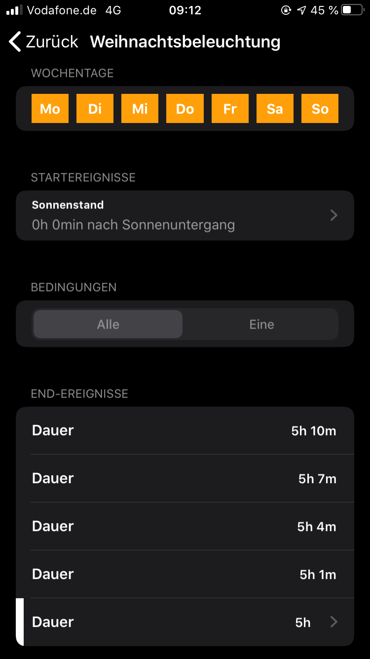 Versuche gerade eine Automation anzulegen mit Startereigniss Sonnenaufgang und Dauer 5 Stunden.