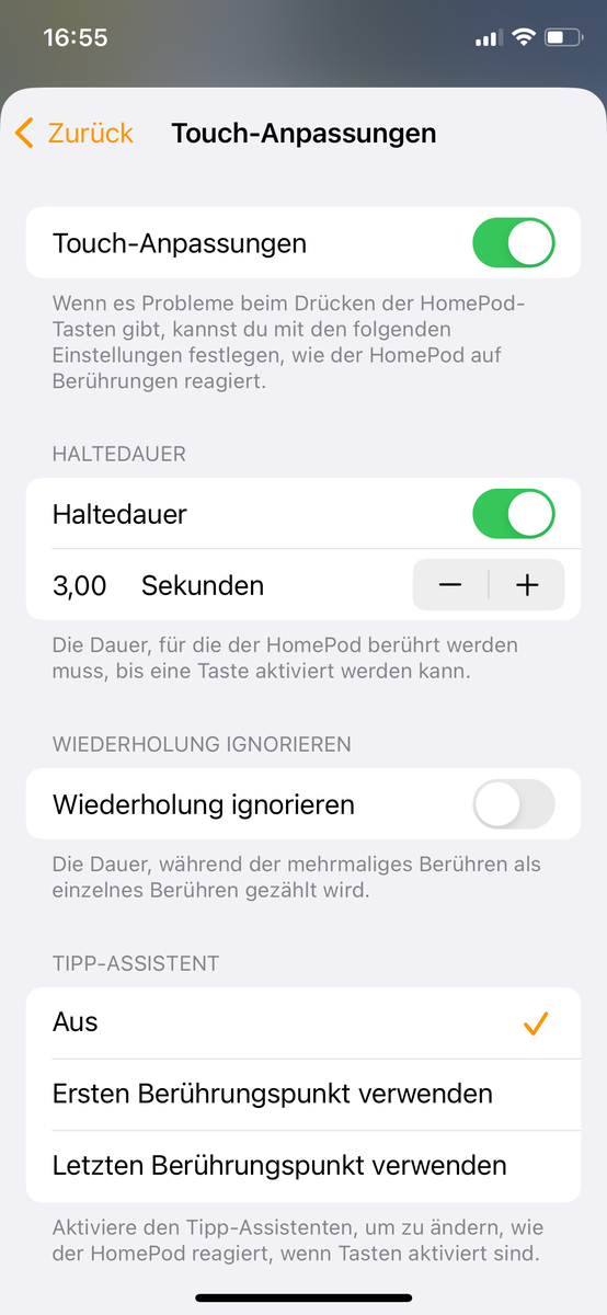 Da wir sowieso Siri nur via Sprache nutzen, wollte ich dieses "Bei Berührung automatische Musikwiedergabe" deaktivieren, jedoch gibt es eine solche Einstellung gar nicht. Nach kurzer Recherche bin ich dann auf Reddit fündig geworden. Man muss in der Home-App in den Homepod Einstellungen unter "Bedienungshilfen > Touch-Anpassungen" lediglich die Haltedauer erhöhen, z.B. auf 3 Sekunden, schon spielt sie nicht mehr ungefragt direkt Musik bei der kleinsten Berührung ab.