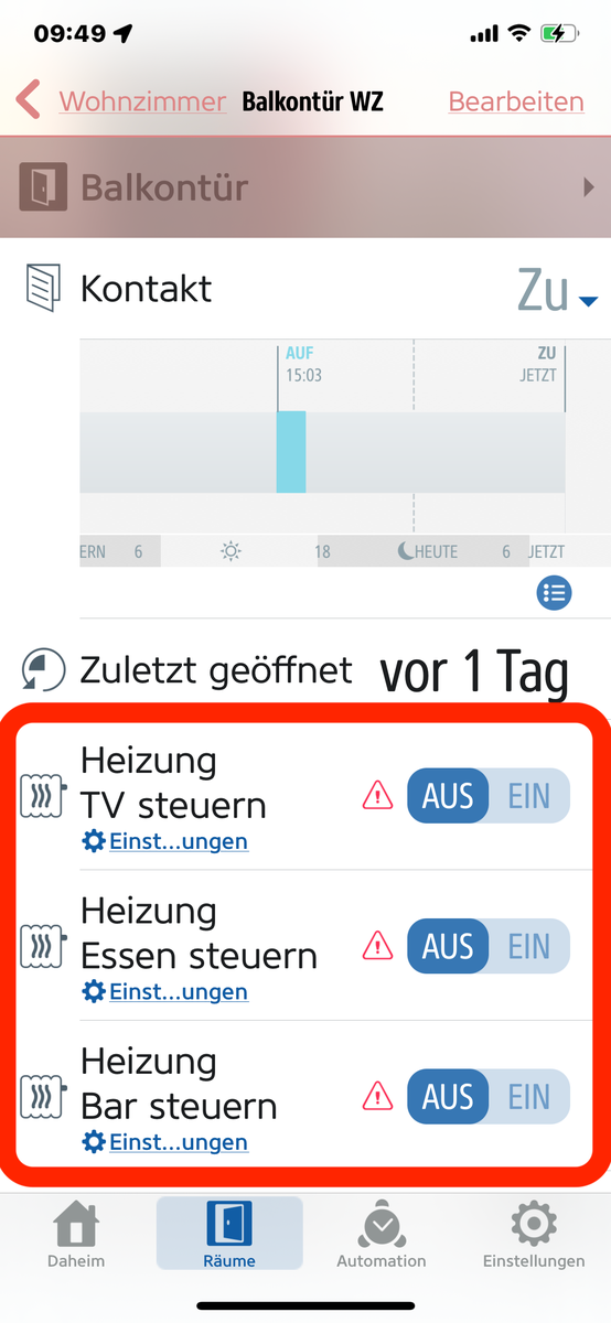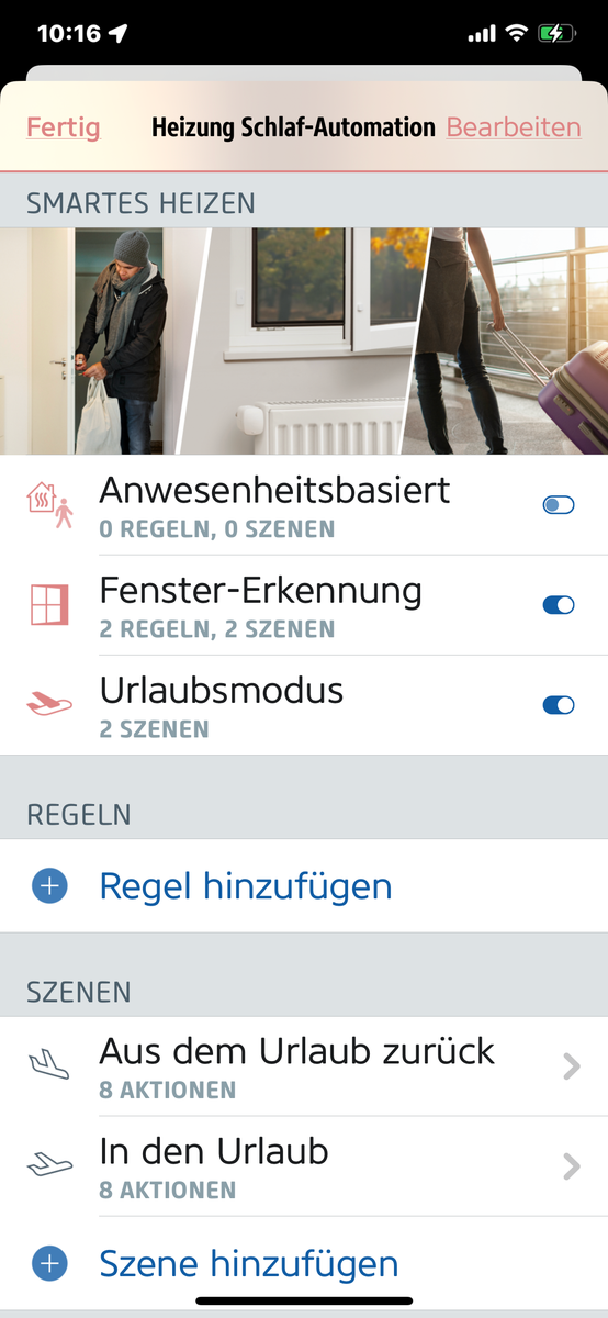 - Fenstererkennung für smartes Heizen ist aktiviert (siehe Screenshot Fentererkennung)