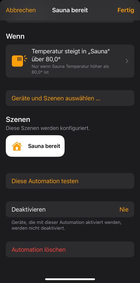 Wenn da kein Kurzbefehl enthalten ist, müsste es ja eine weitere Automation/Kurzbefehl geben der auch mit der Szene „Sauna bereit“ verknüpft ist 🤷🏻‍♀️