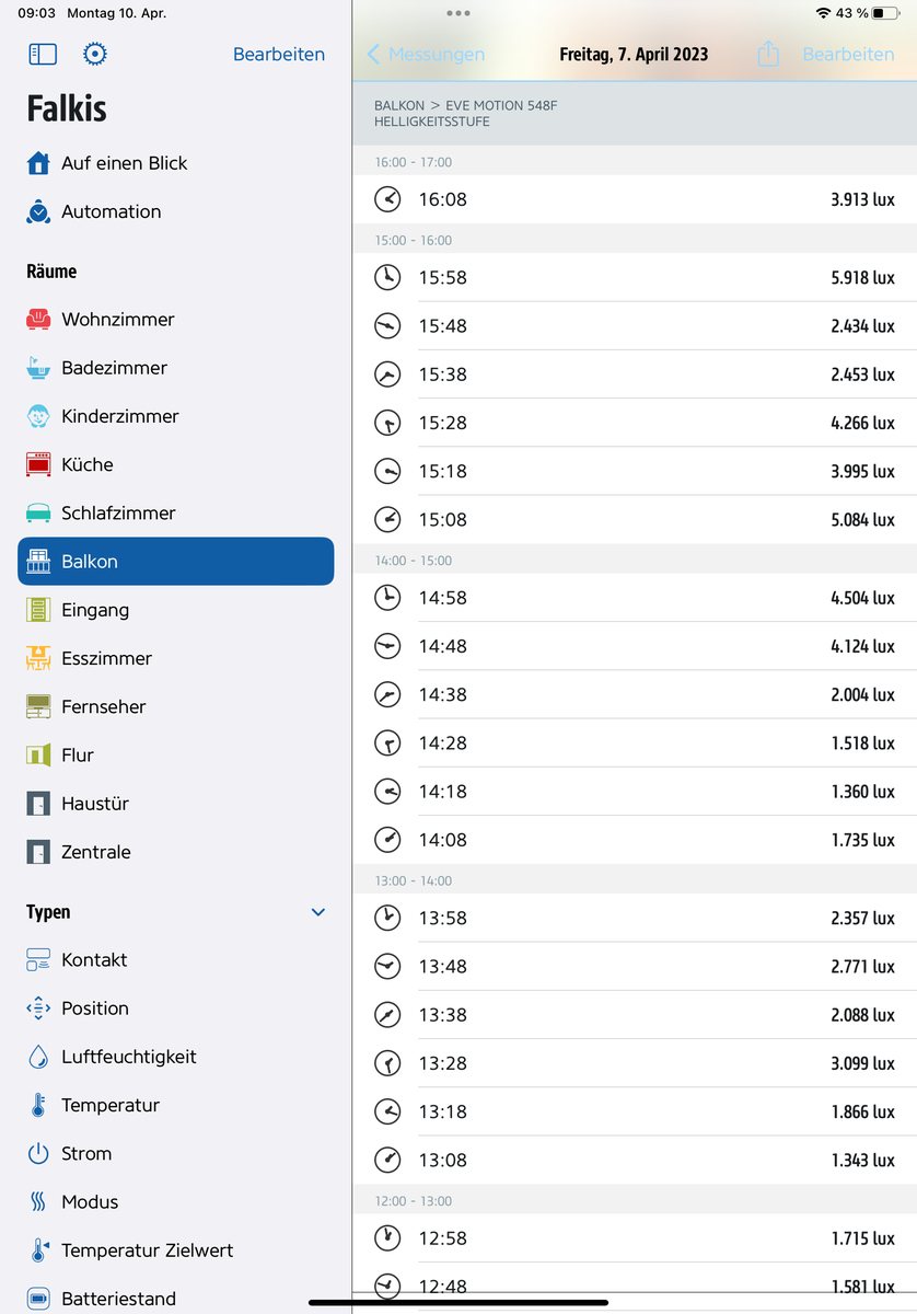 Letzter Wert in Homekit zu dieser Zeit lag bei 1950 LUX. Somit weit im Wohlfühlbereich!