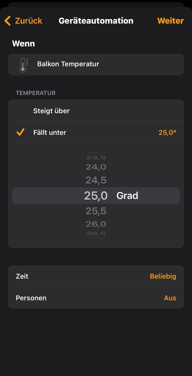Als auslöser wenn die Temperatur am Balkon unter 25 Grad fällt -> Temperatur im Wohnzimmer abfragen -> Wenn die Temperatur im Wohnzimmer höher als 25 Grad ist dann Lüften.