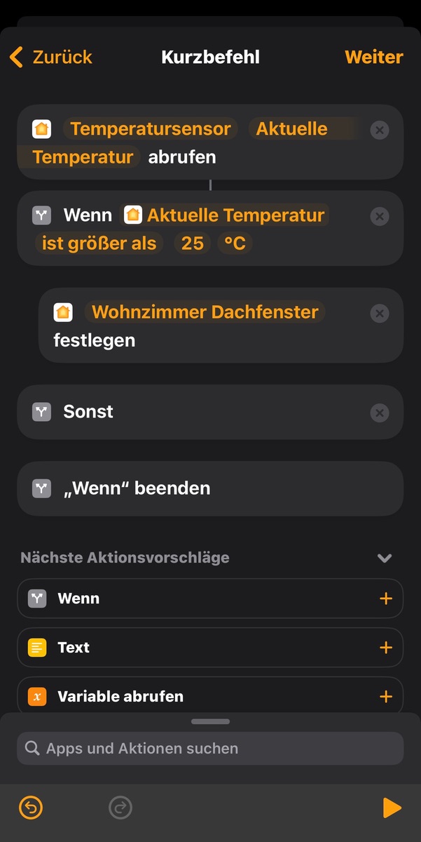 Somit wird der Shortcut beim unterschreiten der Temperatur getriggert, aber gelüftet wird nur wenn die Temperatur im Wohnzimmer über 25 Grad ist.