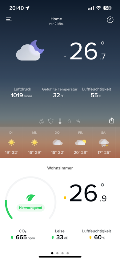 Ich habe gerade 5 Automationen erstellt mit jeweils 10 Minuten Abstand dazwischen. Der KurzBefehl wurde also seit 20:30 Uhr alle 10 Minuten angestoßen. Um 20:40 Uhr kam die Meldung „Zeit zu lüften“! Da waren die Temperaturen wie hier zu sehen erreicht, so dass es Sinn macht, ALLES aufzureißen, was keine Mauer ist.