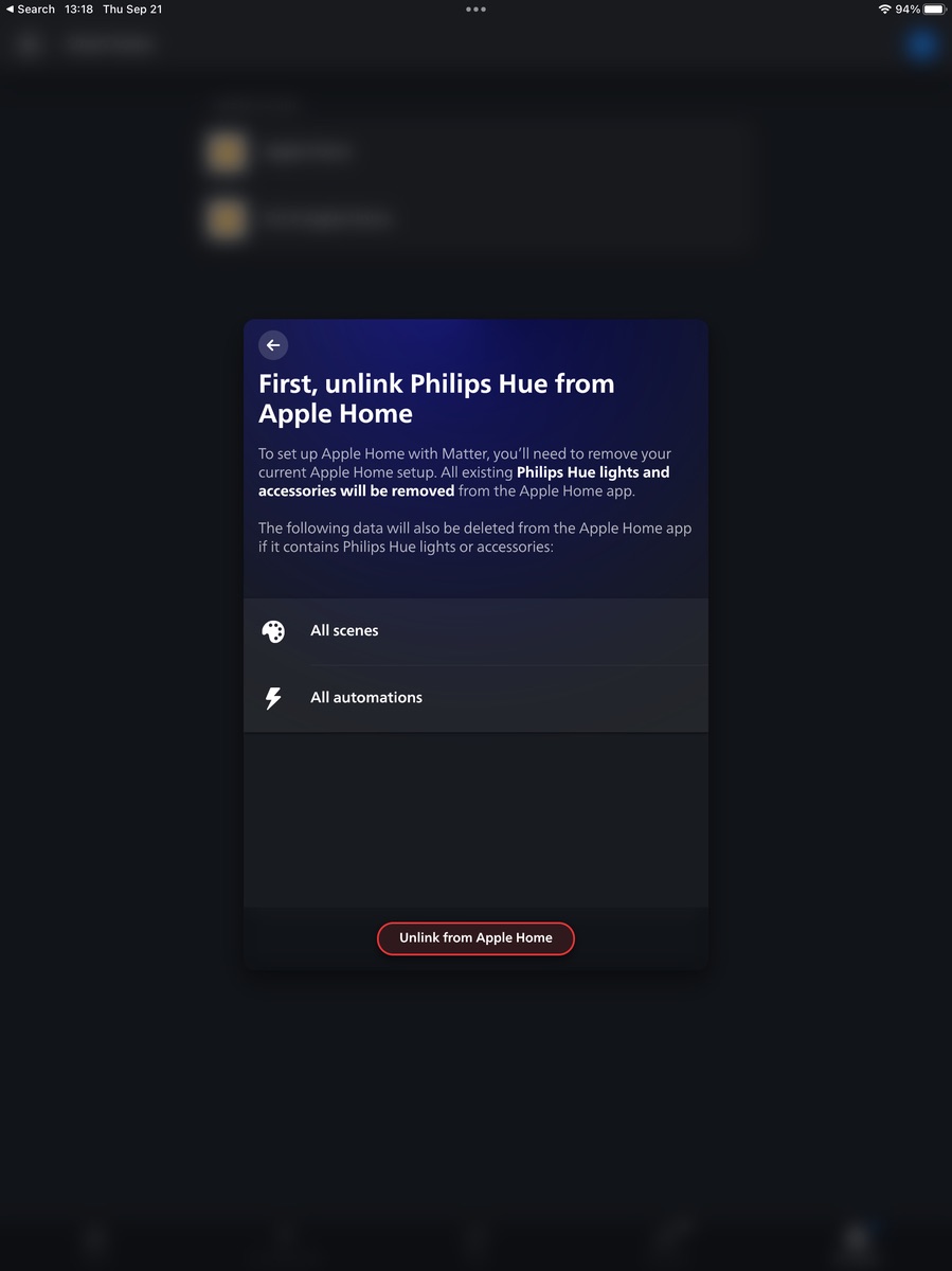 Verbindung getrennt - somit auch alle Hue Lampen in Apple Home erstmal weg.