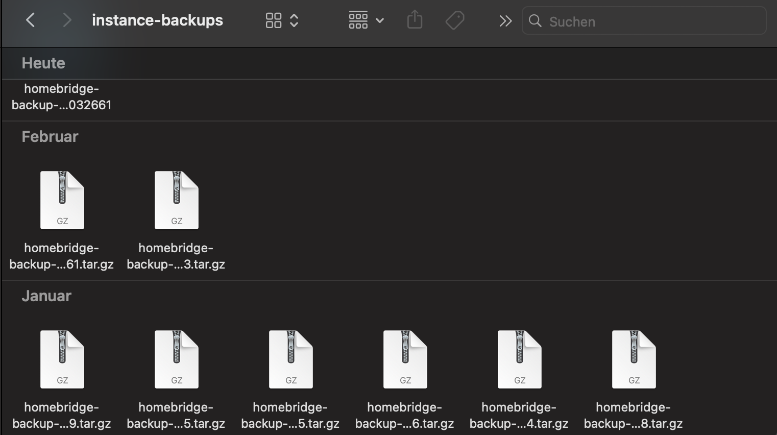 Wenn du den Ordner backups öffnest, sollte darin ein Ordner namens instance-backups zu finden sein. Öffnest du den, sollten sich darin mehrere Dateien mit Namen wie homebridge-backup-CC223DE3CE30.1756874252826.tar.gz befinden. Die Datei mit der höchsten Nummer (1756874252826) ist das aktuellste Backup. Damit hast du das Backup von deinem Raspi auf den Mac übertragen.