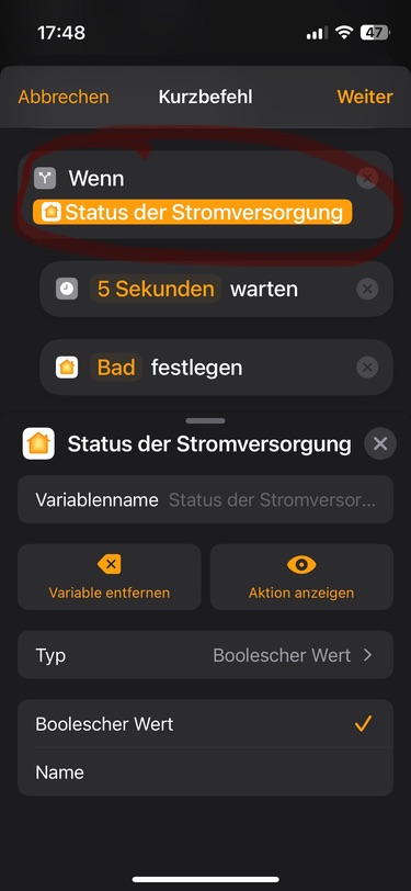 ich wollte eine bestehende Automation, welche einen Kurzbefehl beinhaltet, überarbeiten. Es soll der Status der Stromversorgung abgefragt werden und mit einem „Wenn ist gleich“ darauf reagiert werden.