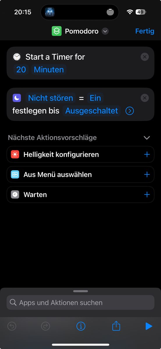 ich habe mir einen Kurzbefehl für meine Pomodor-Zeiten erstellt. Also immer 20 Minuten-Timer, zu deren Anfang der Fokus eingeschaltet wird. Nun hätte ich gerne, dass er nach 20 Minuten auch wieder ausgeschaltet wird, also sobald der Timer endet. Über "Warten" klappt das ja leider nicht, da die Zeit dafür zu lange ist. Gibt es also vielleicht einen Workaround, den ich als Laie noch nicht gefunden habe?