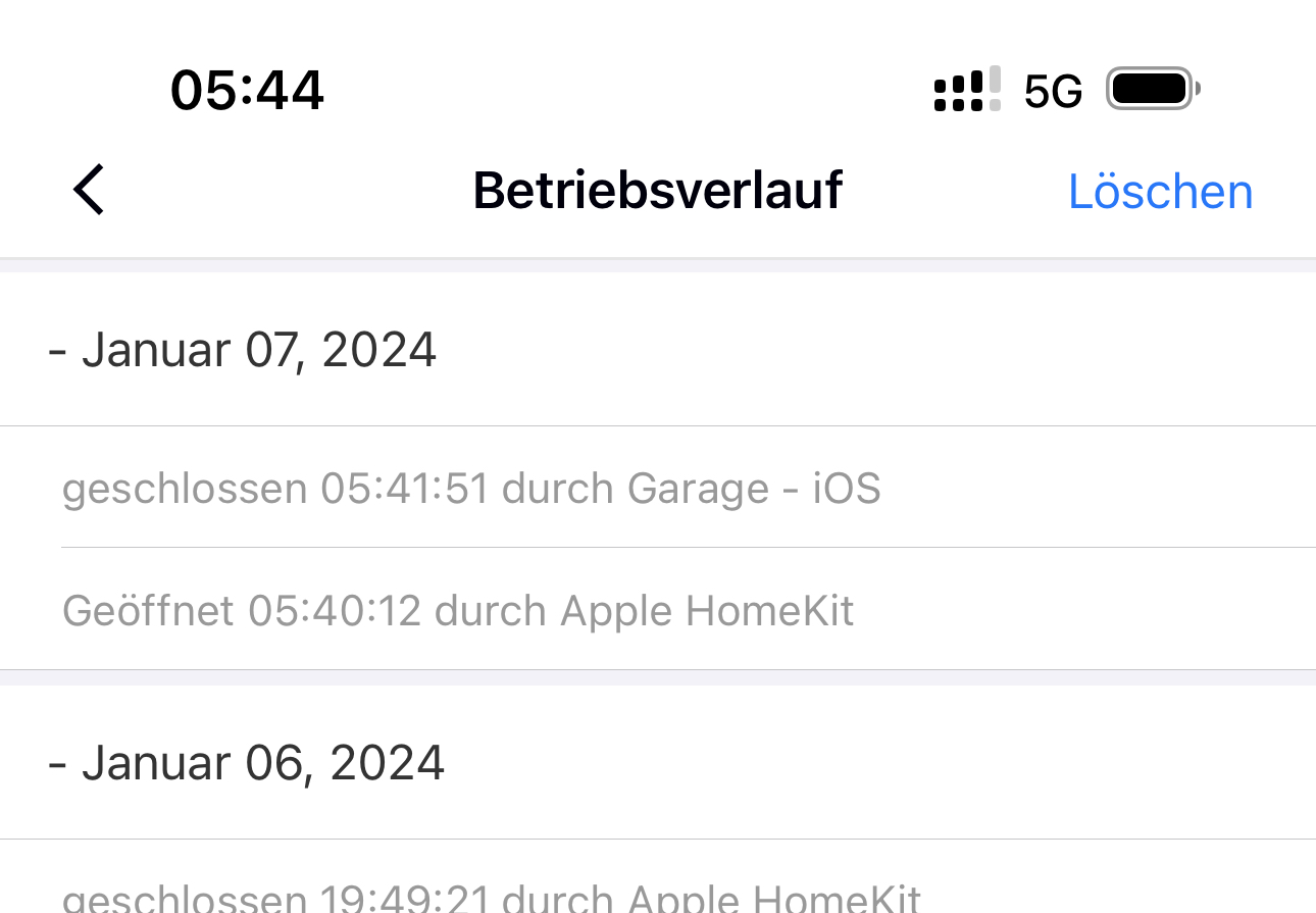 Hier sieht man (Verlauf in der Meross App der Garage), dass es durch Homekit geöffnet, und durch mich wieder geschlossen wurde.