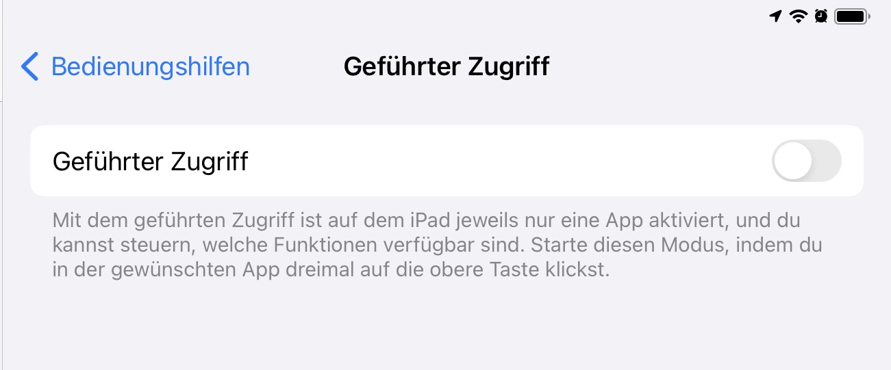 Für die Darstellung des Kamerabildes nutze ich die kostenpflichtige App HomeCam, du kannst im „Geführten Zugriff“ jede installierte App festlegen.