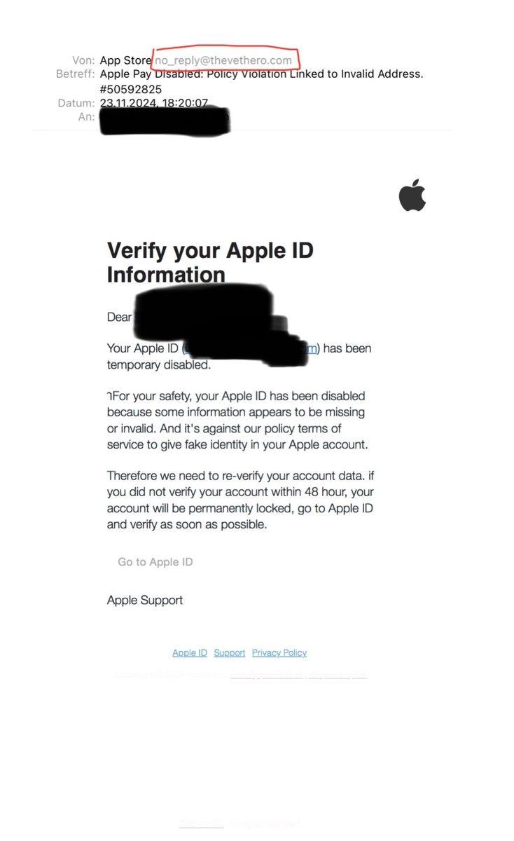 In diesen Fall ist die Mail Adresse „[email protected]“. Diese hat definitiv NICHTS mit Apple zu tun - also eindeutig Fake/Phishing ![]()