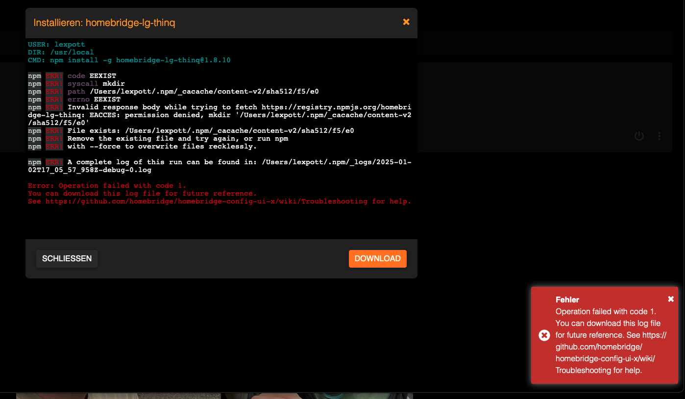 Jetzt wollte ich weiter "nicht homekit " kompatible Geräte hinzufügen doch dann kommt die Fehlermeldung mit dem Code 1. Ich füge ein Bild hinzu.