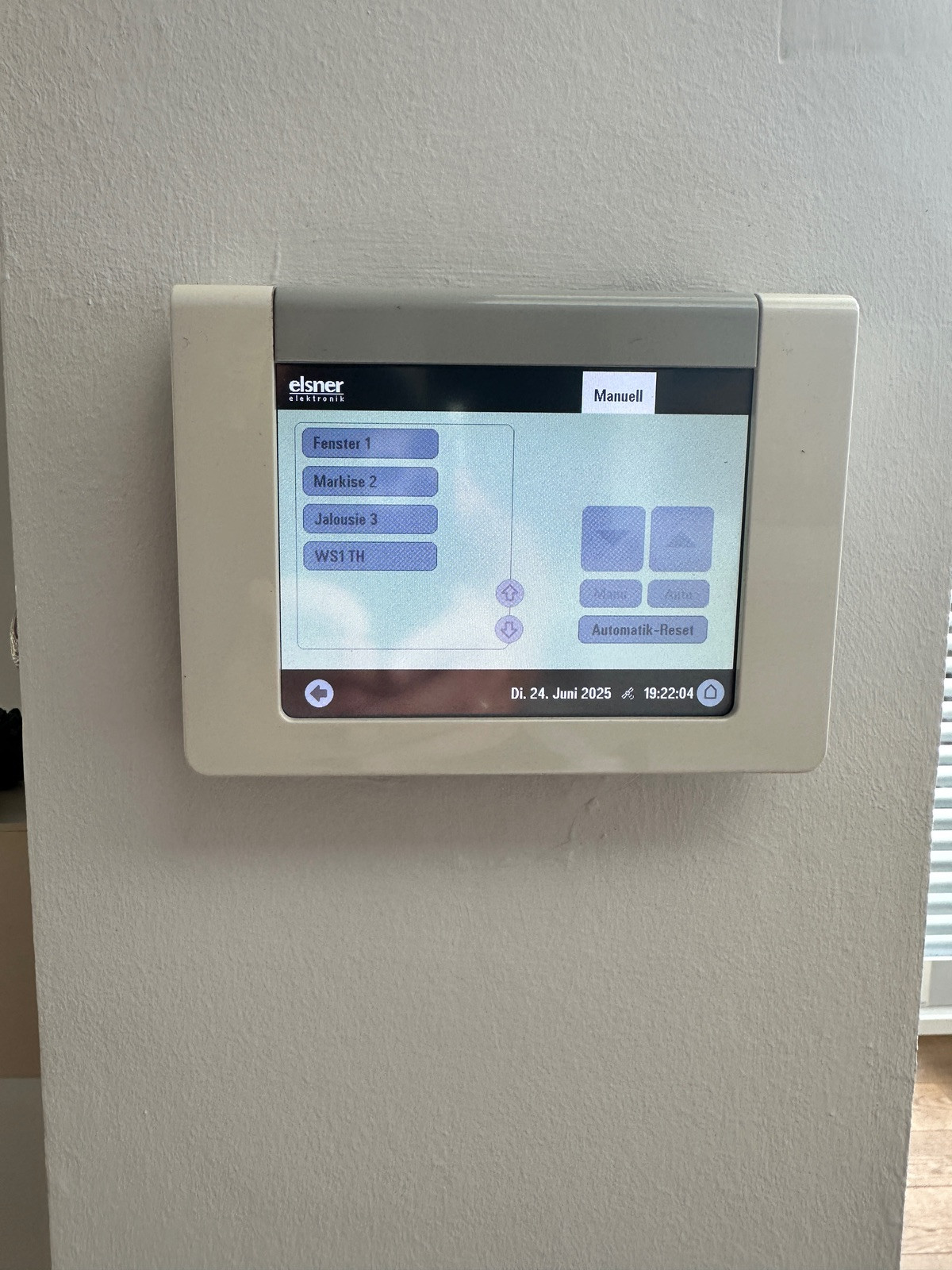 Ich habe im Bild ersichtliche Elsner Wintergartensteuerung. Dieses Dingen ist überteuert und war schon einmal defekt. Es steuert meine elektrischen Dachflächenfenster im Wintergarten; die Markise über dem Wintergarten und die Jalousie vor dem Wintergarten. Neben einigen Dingen, die ich direkt dort eingebe bekommt es dazu Meldungen von der dazugehörigen Wetterstation auf dem Dach. Regen- und Windalarme. Ich kann so gezielt Fenster und Markise schließen lassen.