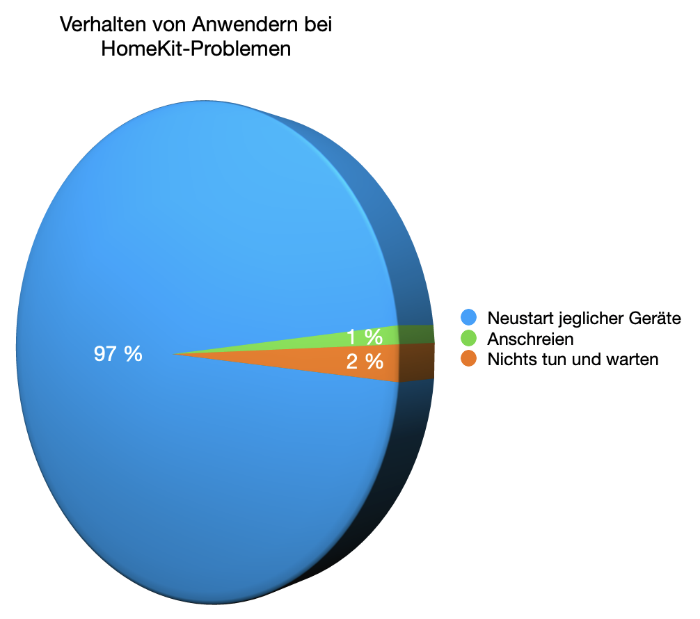 • [A] Aktiver Typ: Lebt nach dem Grundsatz "Reboot tut gut" und glaubt, er könne durch irgendwelche Handlungen irgendeinen Einfluss auf die Funktionsweise von HomeKit nehmen. Der aktive Typ startet zunächst das betreffende smarte Gerät neu, danach alle Steuerzentralen, danach alle anderen smarten Geräte, dann alle iPhones, iPads und Macs und zum Schluss alle Netzwerkkomponenten wie Switches und Router. Ein kleiner Teil des aktiven Typs ruft sogar die Stadtwerke an mit der Bitte, kurz den Strom im ganzen Viertel aus- und dann wieder einzuschalten. Diese Vorgehensweise hilft tatsächlich nach ein paar Tagen.