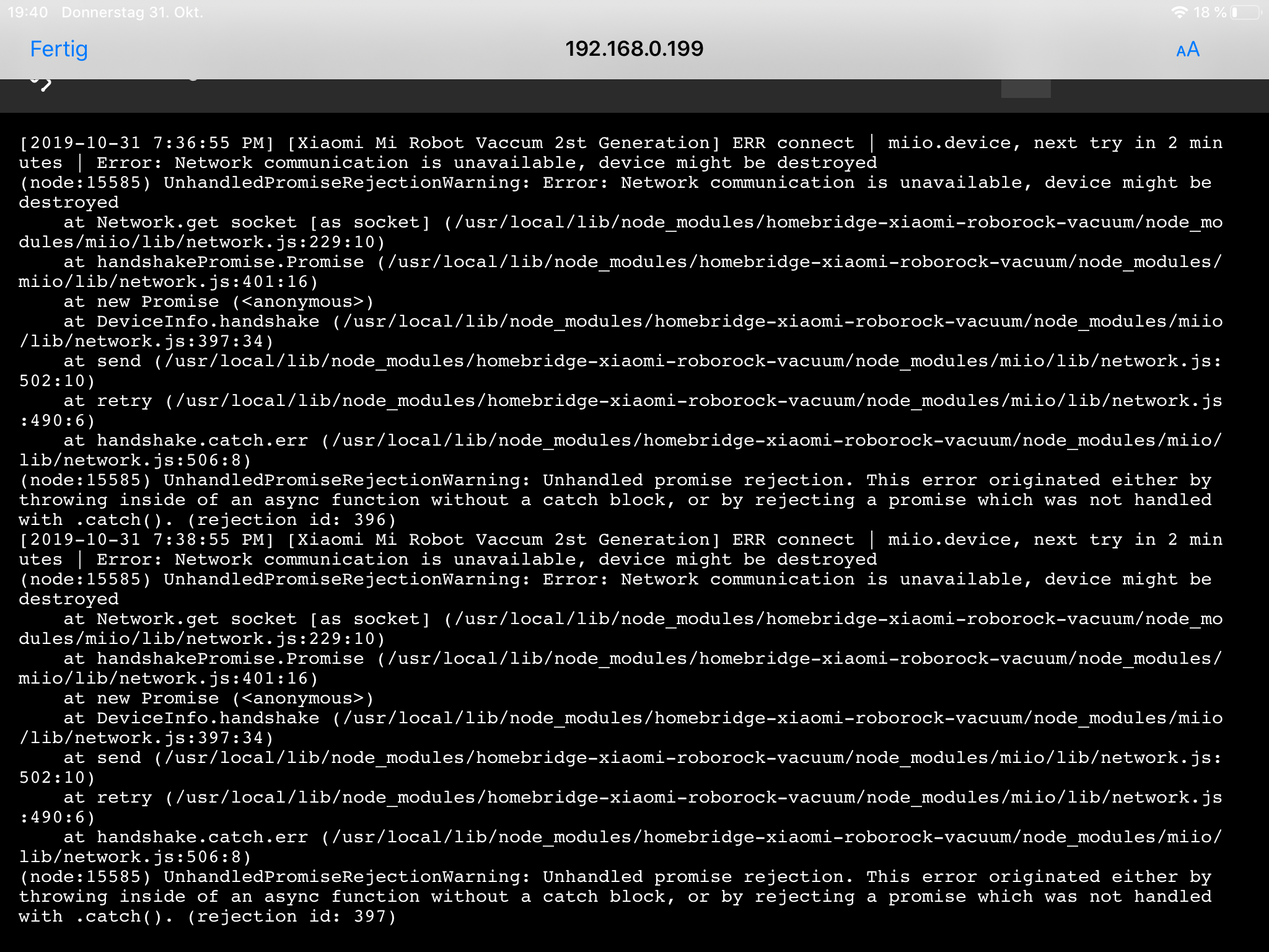 [2019-11-2 1:56:04 PM] [Xiaomi Mi Robot Vaccum 2st Generation] ERR connect | miio.device, next try in 2 minutes | Error: Could not connect to device, handshake timeout
