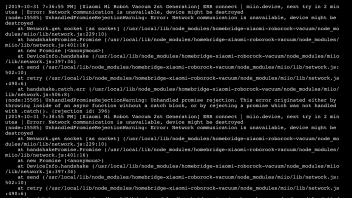 [2019-11-2 1:55:54 PM] [Xiaomi Mi Robot Vaccum 2st Generation] ERR connect | miio.device, next try in 2 minutes | Error: Could not connect to device, handshake timeout