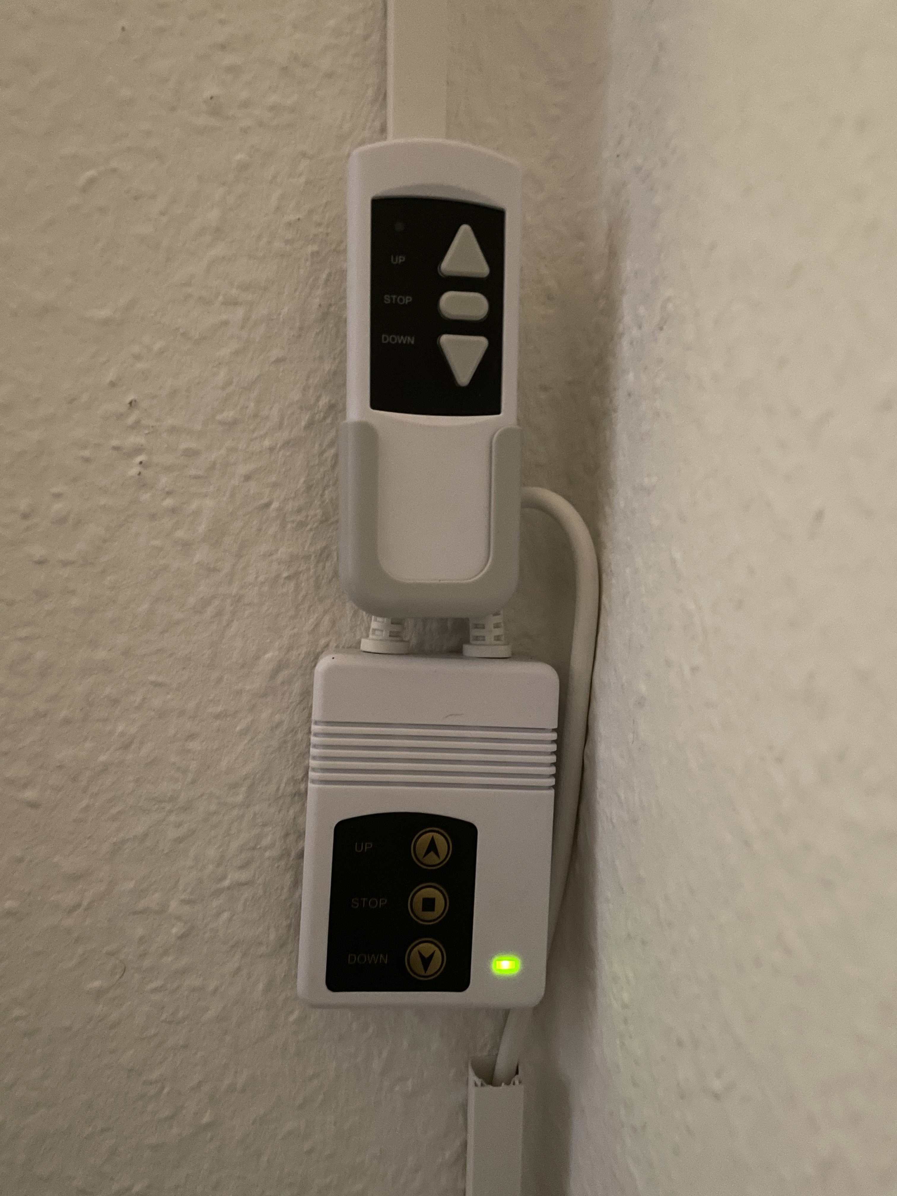Die Leinwand hat eine Fernbedienung (433.92 Mhz) Raus, Stop, Runter