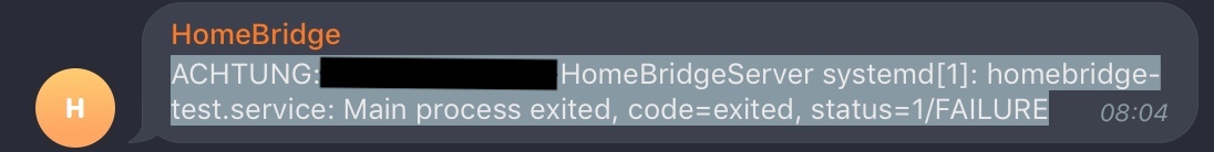 Ab jetzt ist die Überwachung durch das reporter.sh Tool bei jedem System Start automatisch aktiviert und es wird eine Benachrichtigung gemäß der festgelegten Suchbegriffe auf ein Ereignis erfolgen. Eine Benachrichtigung über denn regulären Start oder Stopp einer Homebridge / Instanz erfolgt nicht. Nur bei Absturz. Sollte das gewünscht sein muss der Suchbegriff dementsprechend erweitert oder geändert werden.