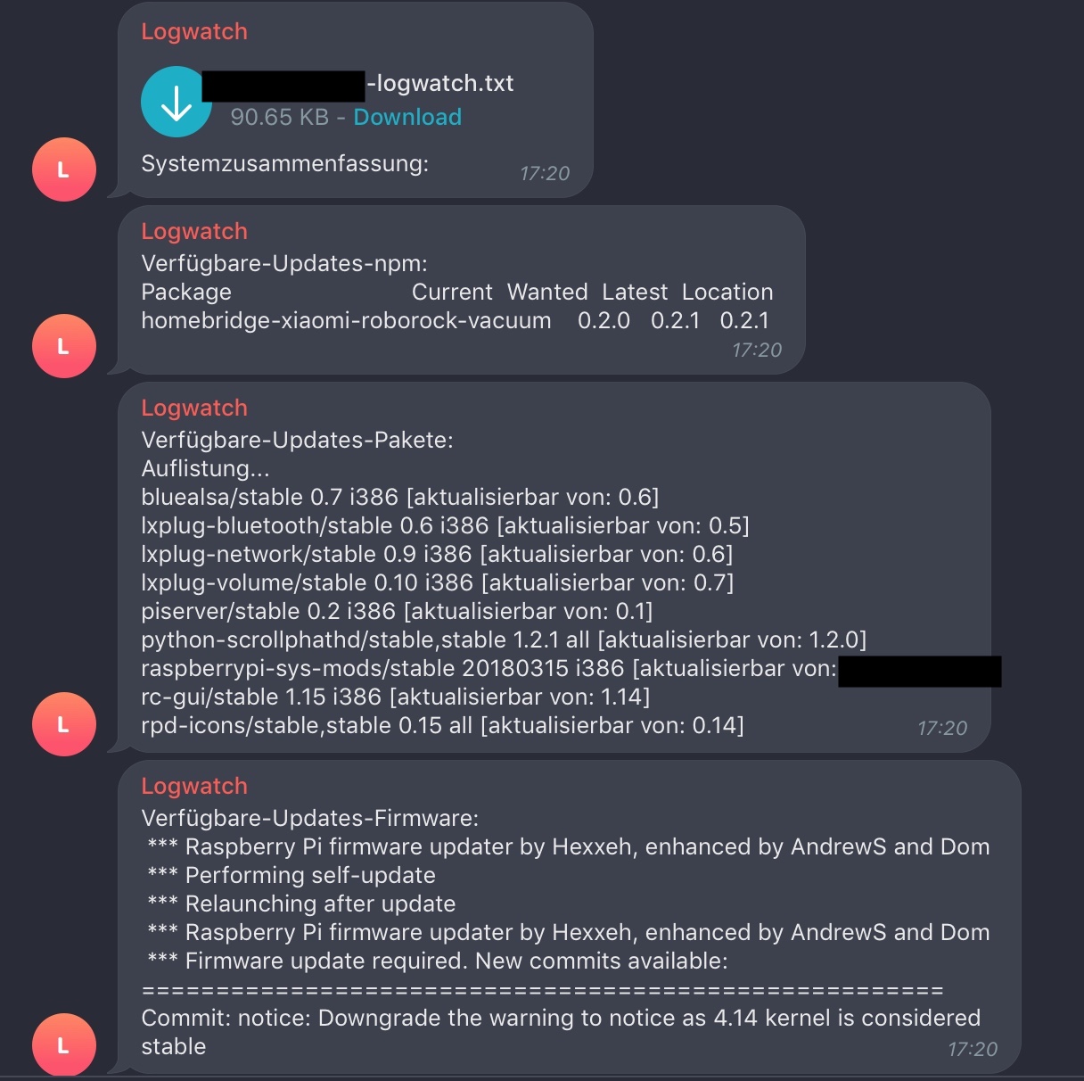 Das Tool logwatch.sh ermöglicht in Zusammenarbeit mit der Software Logwatch eine tägliche Zusammenfassung der System Logdateien. Es werden alle wichtigen Ereignisse gebündelt und per Telegram versendete.