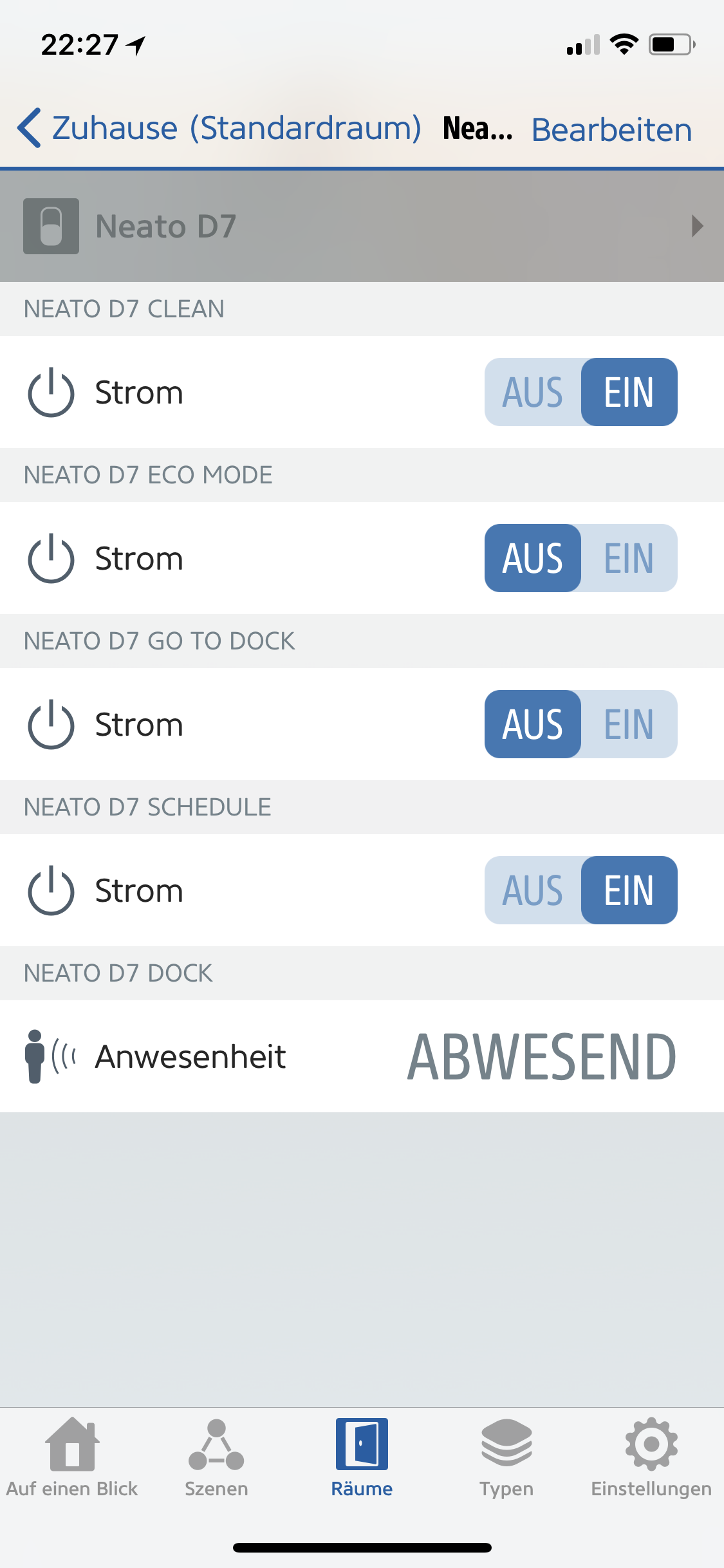 Ich habe sie Switches in HomeKit jetzt so eingestellt dass er losfährt sobald die letzte Person das Haus verlässt aber wieder aufhört wenn die erste Person heim kommt.