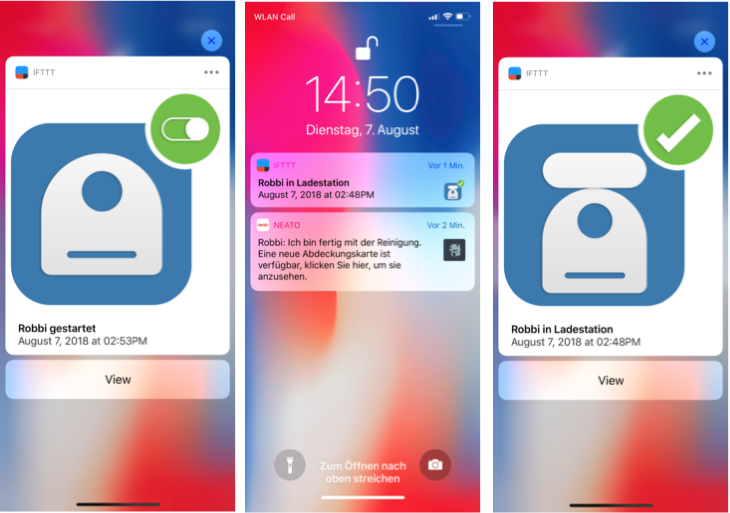 Zudem hab ich mir über das tolle homebridge-neato Plugin von @naofireblade und dem IFTTT Plugin zusätzlich eine eigene Notification gebastelt, wenn er startet und wieder in der Dock ist. Einfach weil es geht und nett aussieht.