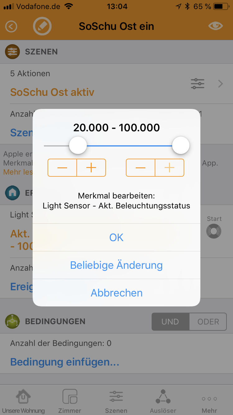 Das eigentliche Problem ist aber nicht der Auslöser (Zeit) sondern die Bedingung. Die Rolladen fahren auch runter, wenn der Lux-Wert eigentlich nicht überschritten wird.