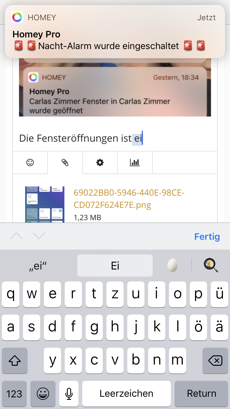 Die Pushfunktion ist der Hammer! Man kann sich ALLES Benachrichtigen lassen. Sogar Werte von Variablen. Mein iPhone bimmelt momentan die ganze Zeit, weil ich alles austeste. Und Ja, native. Also Push über die Homey App, check: