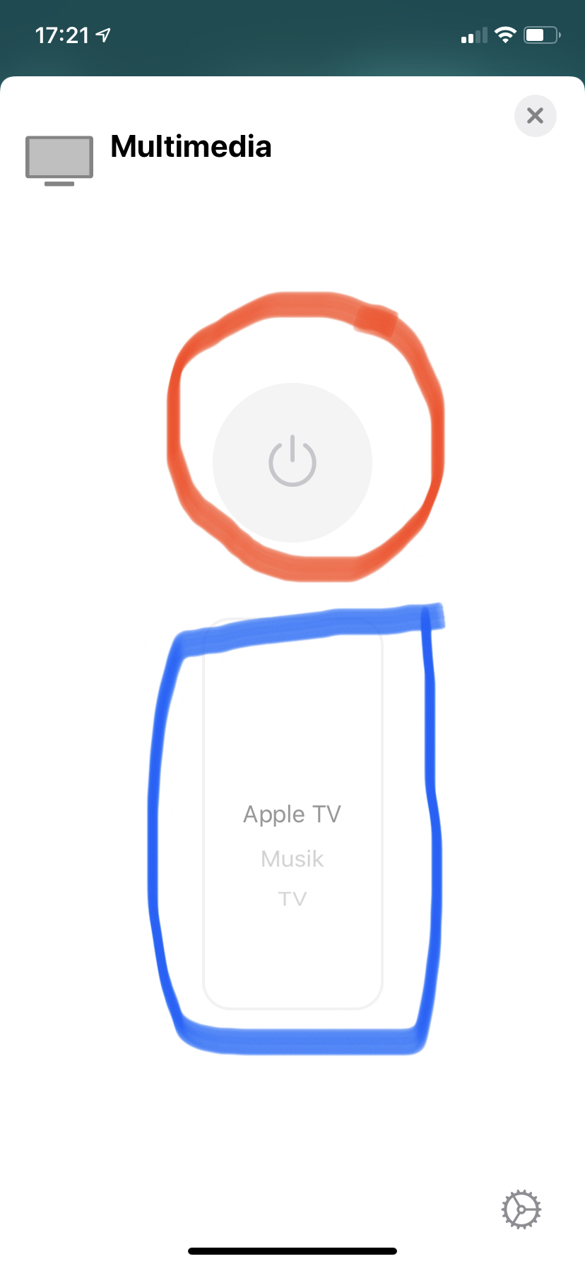 In Homekit (Home APP) kann man durch langes drücken in die Details gelangen. Und hier kann ich die verschiedenen Aktionen auswählen (s. blauer Kasten), aber leider nur wenn ich vorher auf den On/Off Knopf (roter Kreis) gedrückt habe. Leider ist hier das Problem, dass immer "TV" gestartet wird, obwohl ich z.b. gerne "Musik" oder "AppleTV" auswählen möchte.