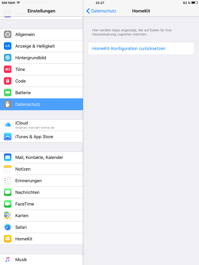 Und dann unter Datenschutz "HomeKit Konfiguration zurücksetzen": Setze ich dadurch die iPad Einstellungen für HK zurück oder mein ganzes System?