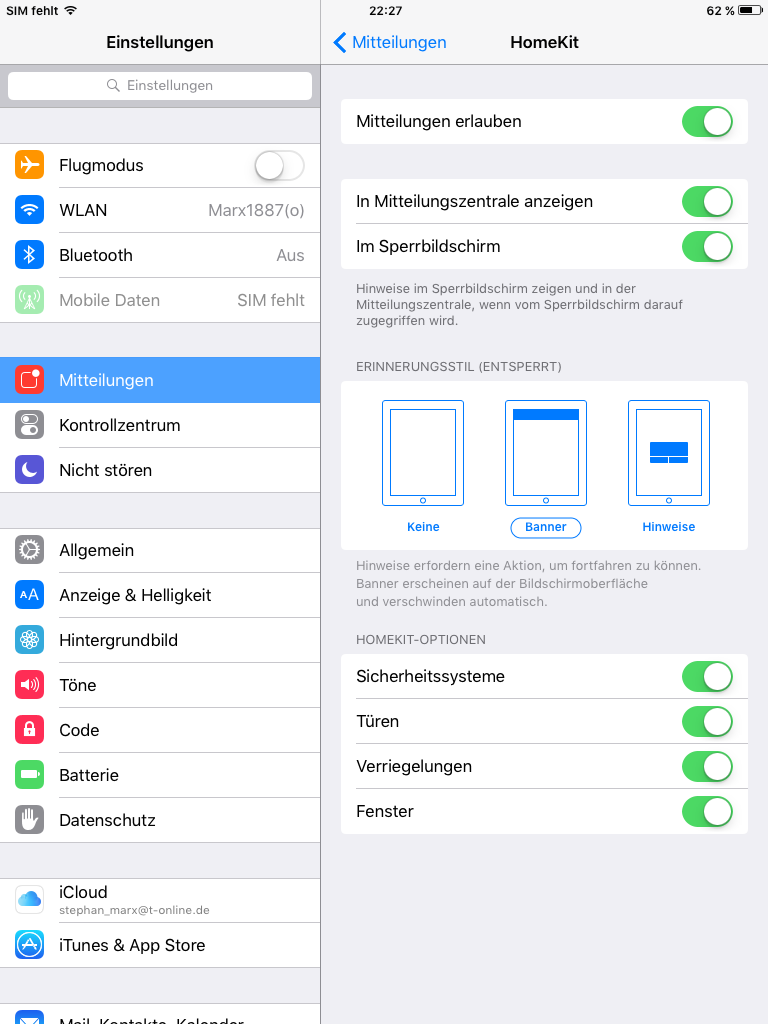 Und was soll das bei "Mitteilungen erlauben" bedeuten? Mitteilungen aufs iPad erhalte ich keine, beim Öffnen eines Fensters zB. Oder sollten diese kommen, wenn ich über mein iPhone Mitteilung fürs Fenster eingestellt habe (gleiche iCloud)?