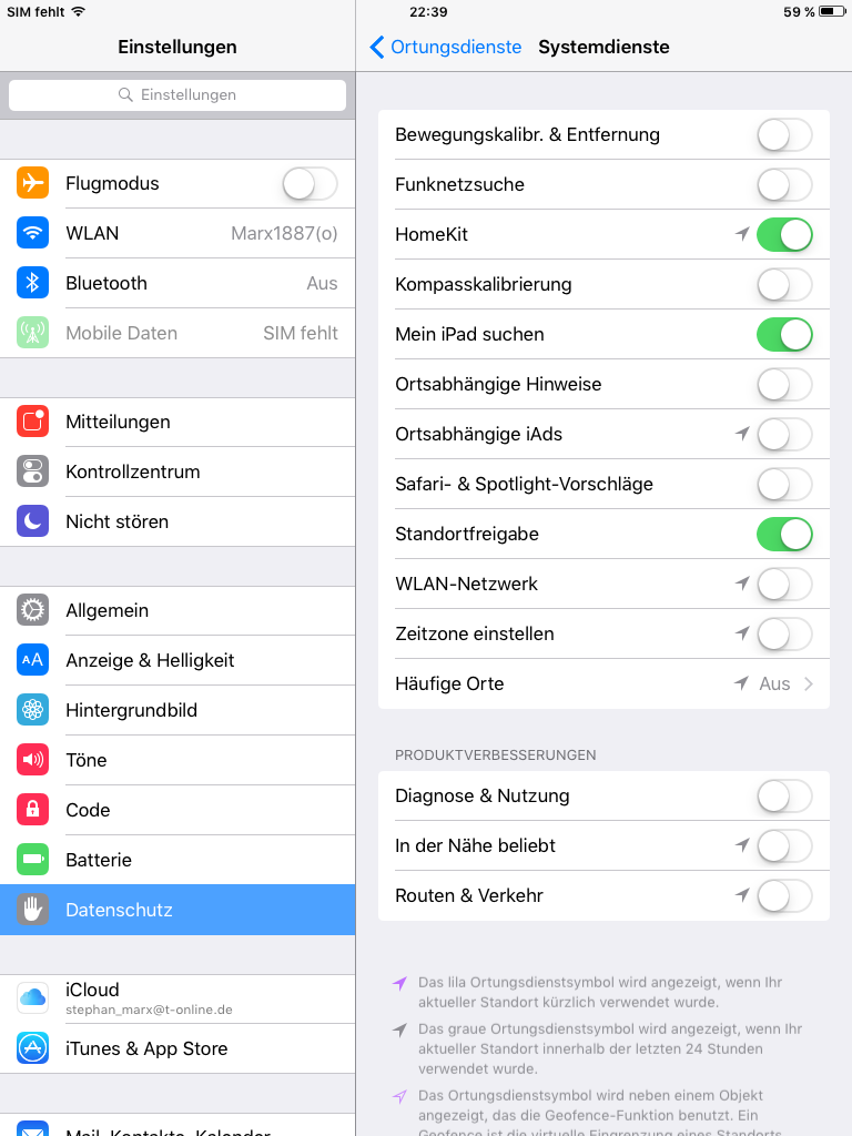 Und was sollen die Ortungsdienst-Einstellungen im iPad, die scheinbar auch genutzt werden (grauer Pfeil)? Warum ortet HK das iPad?