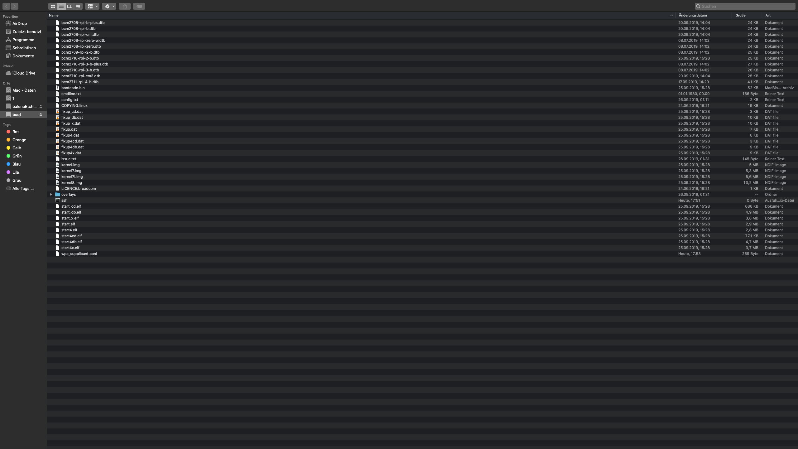 • nach erneutem einlegen der SD Karte in den Mac ist die wpa_supplicant.conf Datei verschwunden.